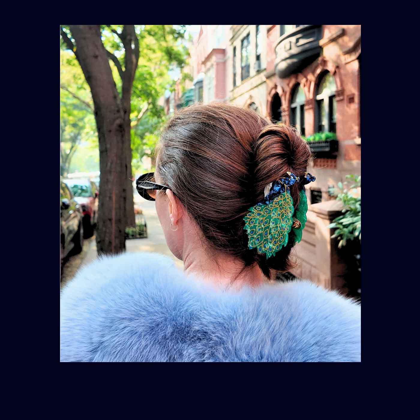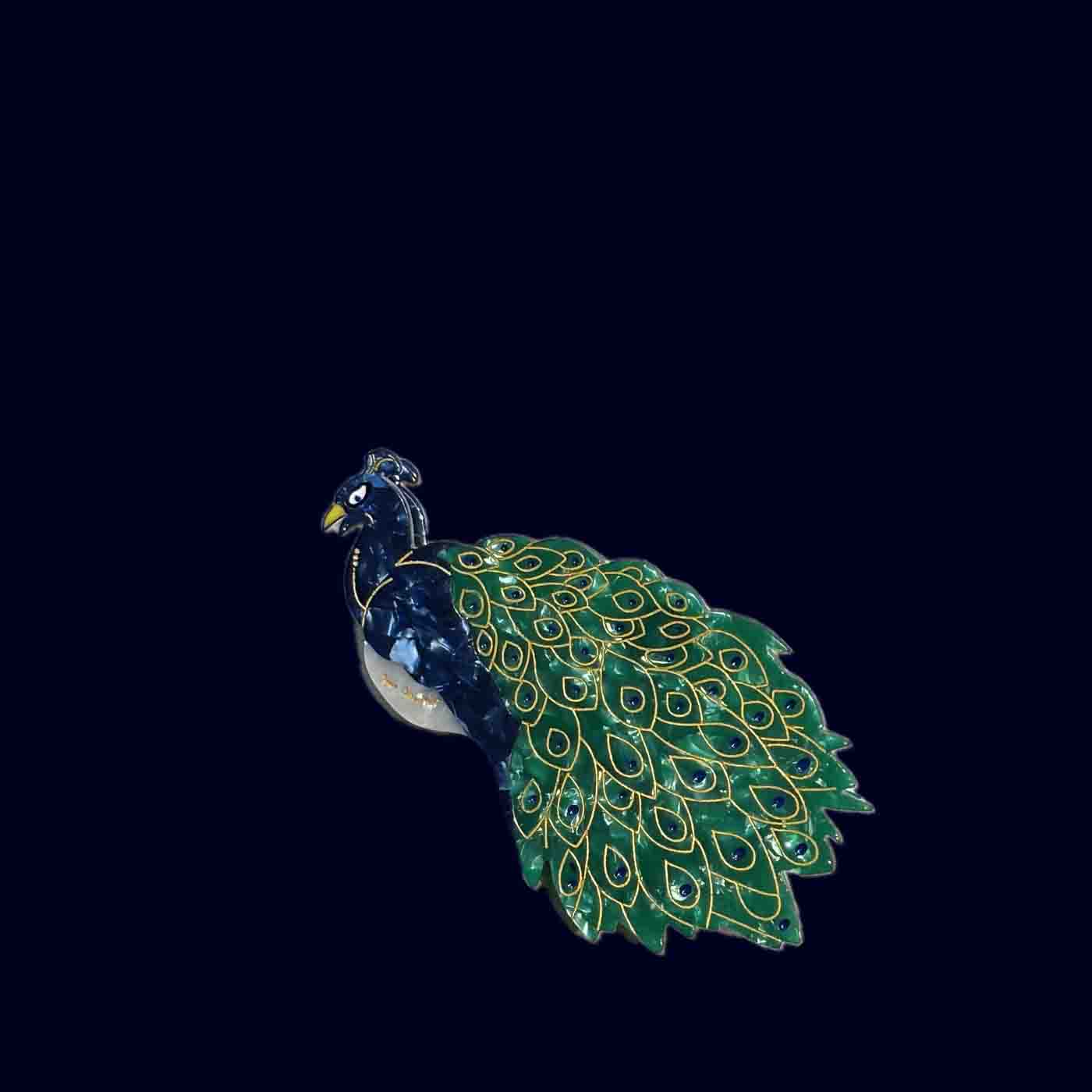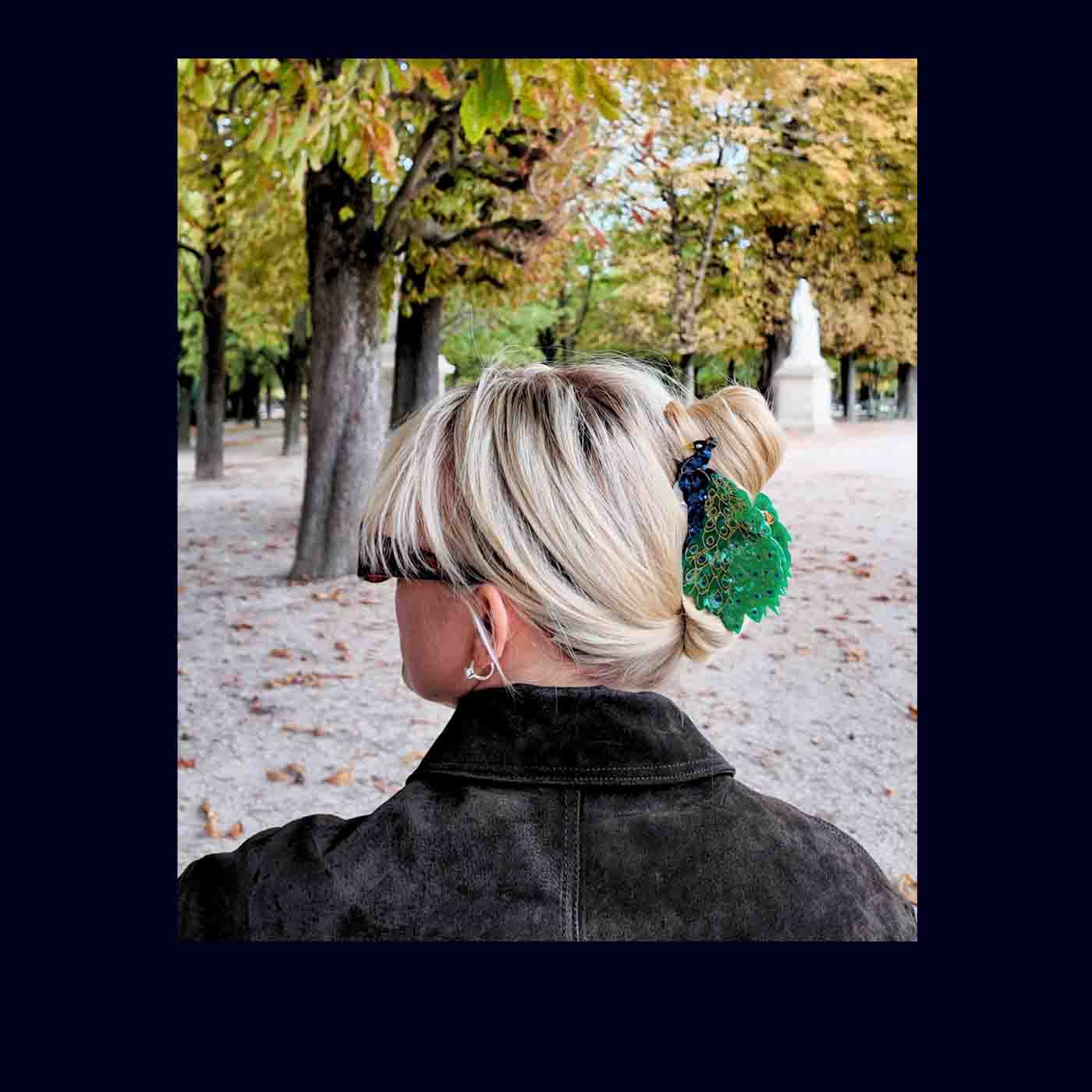 A small everyday luxury, with a touch of theatrical flair. The Peacock Hair Claw by Solar Eclipse is a hand-painted sculptural clip inspired by the iridescent elegance of a peacock’s tail — deep blues, emerald greens, and fine gold detailing that catches the light with every movement.