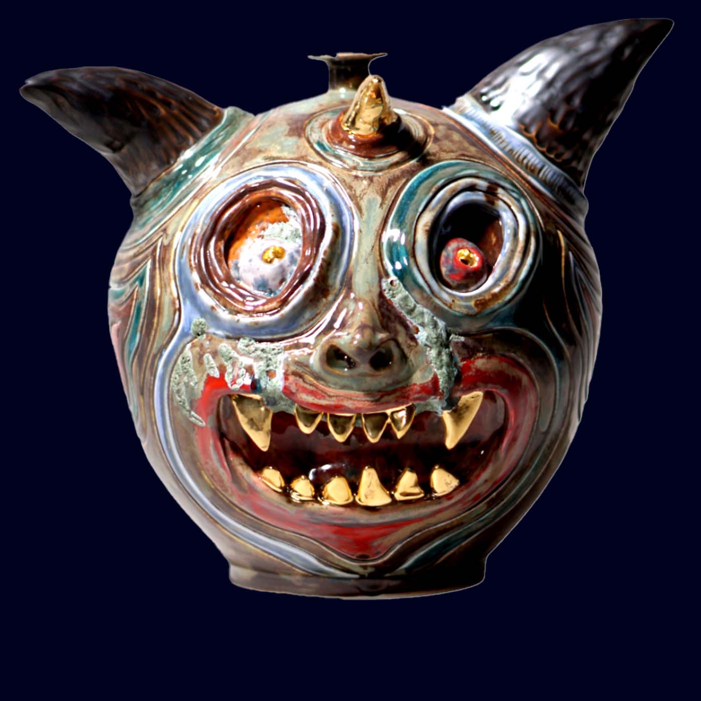 Dogabi Sculptural Jar No. 6 is a riot of expression—a wide-eyed, golden-toothed spirit caught somewhere between laughter and delirium. Hand-thrown and sculpted by Hyung Jun Kim at THR Studio in South Korea, this one-of-a-kind work embodies the chaotic vitality of the Dogabi myth. The swirling layers of glaze and distorted features suggest a creature mid-metamorphosis—one eye seeing the visible world, the other the invisible.