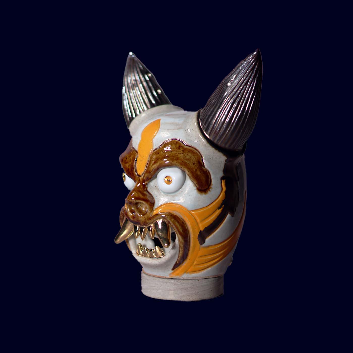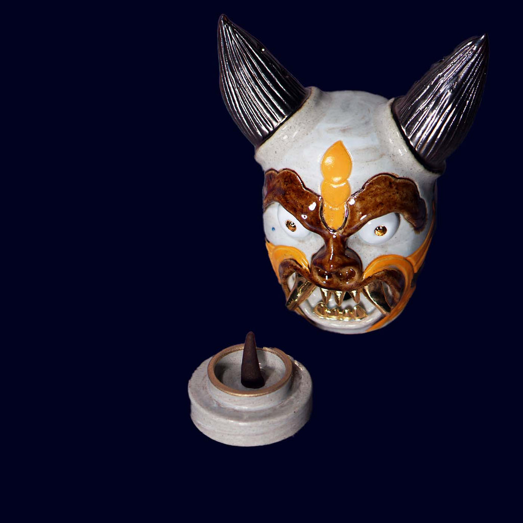The expressive face—crafted from white porcelain and detailed with 23.5 k gold—embodies the dual nature of the Dogabi: humorous and fearsome, familiar and otherworldly. Its versatile design allows for burning cone or stick incense (a removable holder is included), or for housing a tealight candle to create a warm, flickering glow. Even at rest, its mythic visage and richly glazed surface make it a commanding presence on any table or shelf.