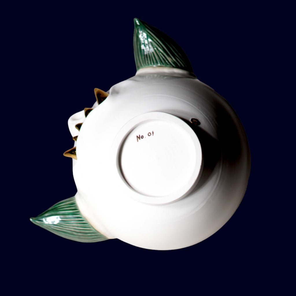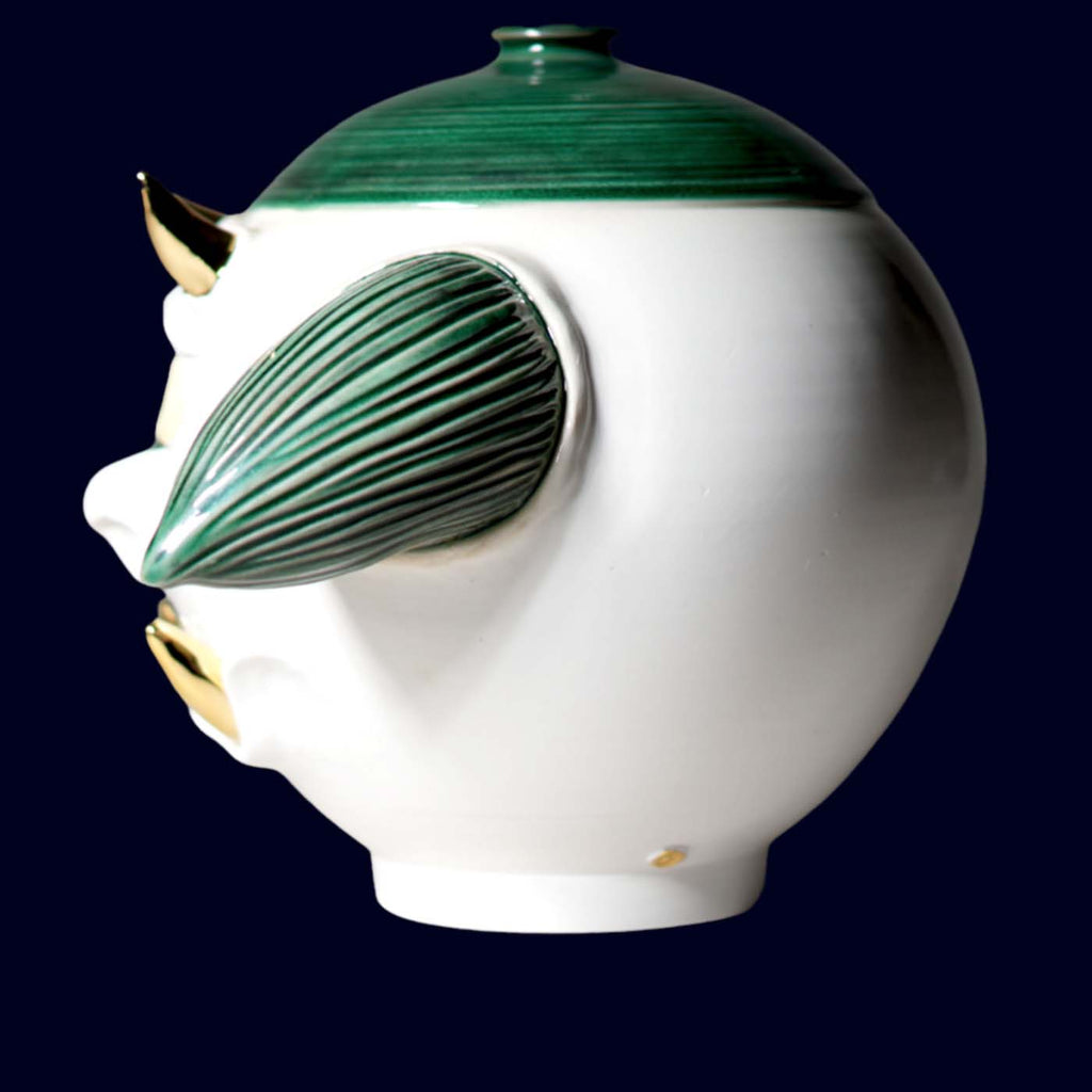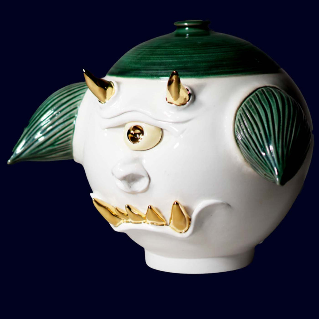 Dogabi Sculptural Jar No. 1 marks the beginning of Hyung Jun Kim’s mythic series—an early and essential work that sets the tone for what Dogabi would become. Hand-thrown and sculpted at THR Studio in South Korea, this one-of-a-kind piece embodies both humor and divinity. Its cyclopean gaze and leaf-like ears recall the forest spirits of Korean folklore, while its ivory glaze and golden accents lend it an unexpectedly gentle majesty.