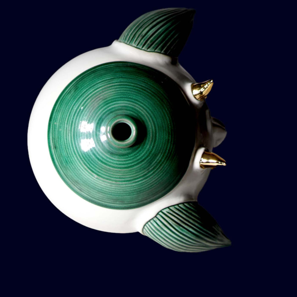 Created from a clay formula developed exclusively at THR Studio, this jar exemplifies Kim’s constant material experimentation. The pure white stoneware body contrasts with deep green glazing and brilliant 23.5-karat gold detailing, producing a visual tension between innocence and power.