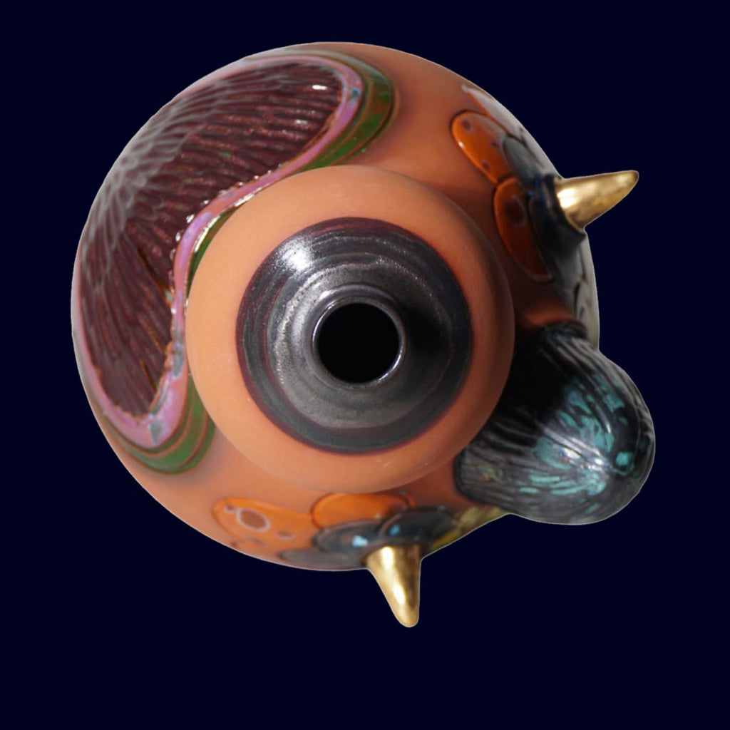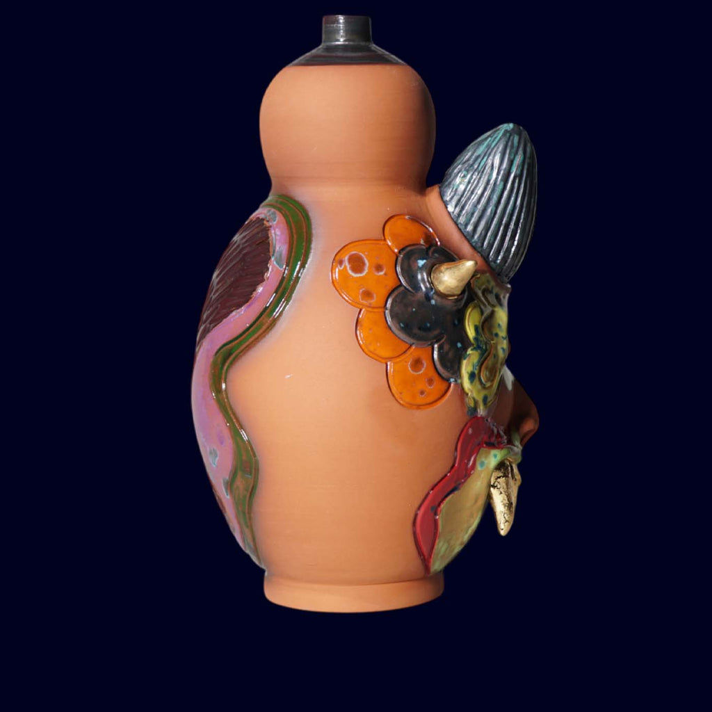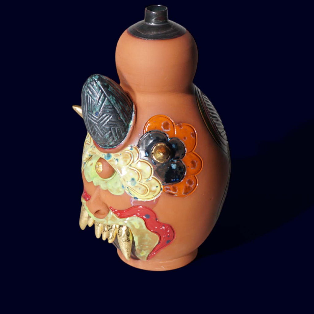 Dogabi Sculptural Jar No. 11 is a vibrant embodiment of the series’ spirit—mischievous, commanding, and alive with color. Its bulbous silhouette and layered glazes give the impression of a myth caught mid-transformation. The single golden eye peers from beneath a crown-like ridge, framed by a fiery grin of teeth plated in 23.5 K gold.