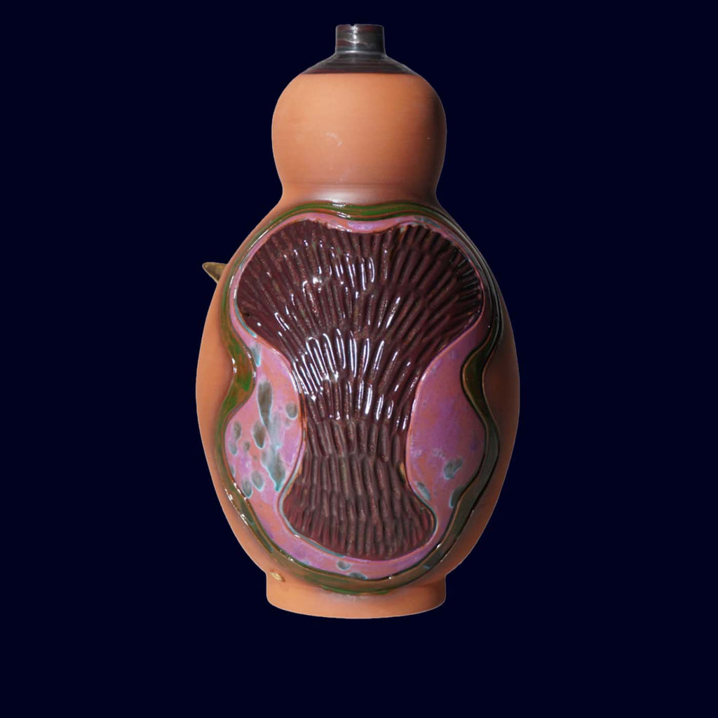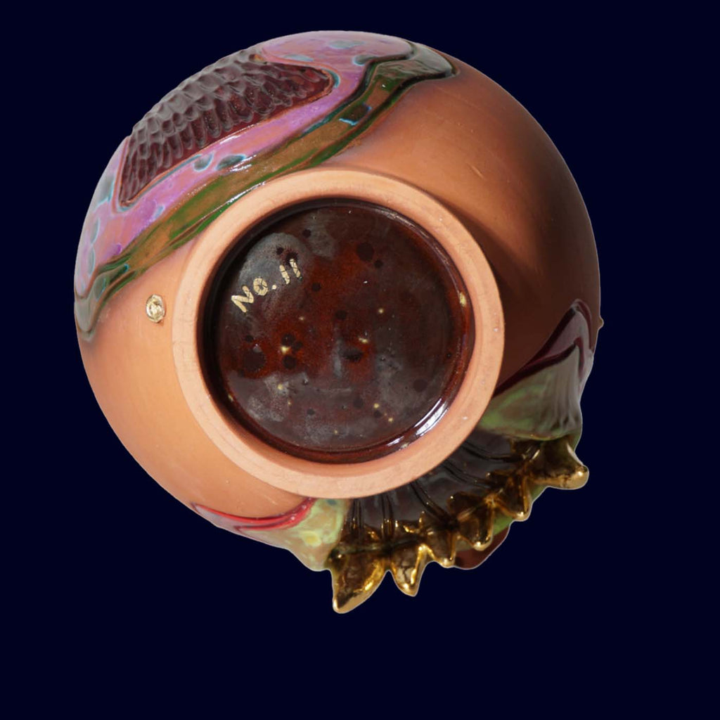 Formed from traditional Korean stoneware clay, Jar No. 11 underwent a high-temperature oxidation firing at 2,012 °F before a secondary glaze firing at 1,472 °F—processes that reveal Kim’s mastery of both technique and chance. The palette of ochre, green, and scarlet underscores the piece’s playful ferocity, while gold horns and teeth glint like ritual adornments.