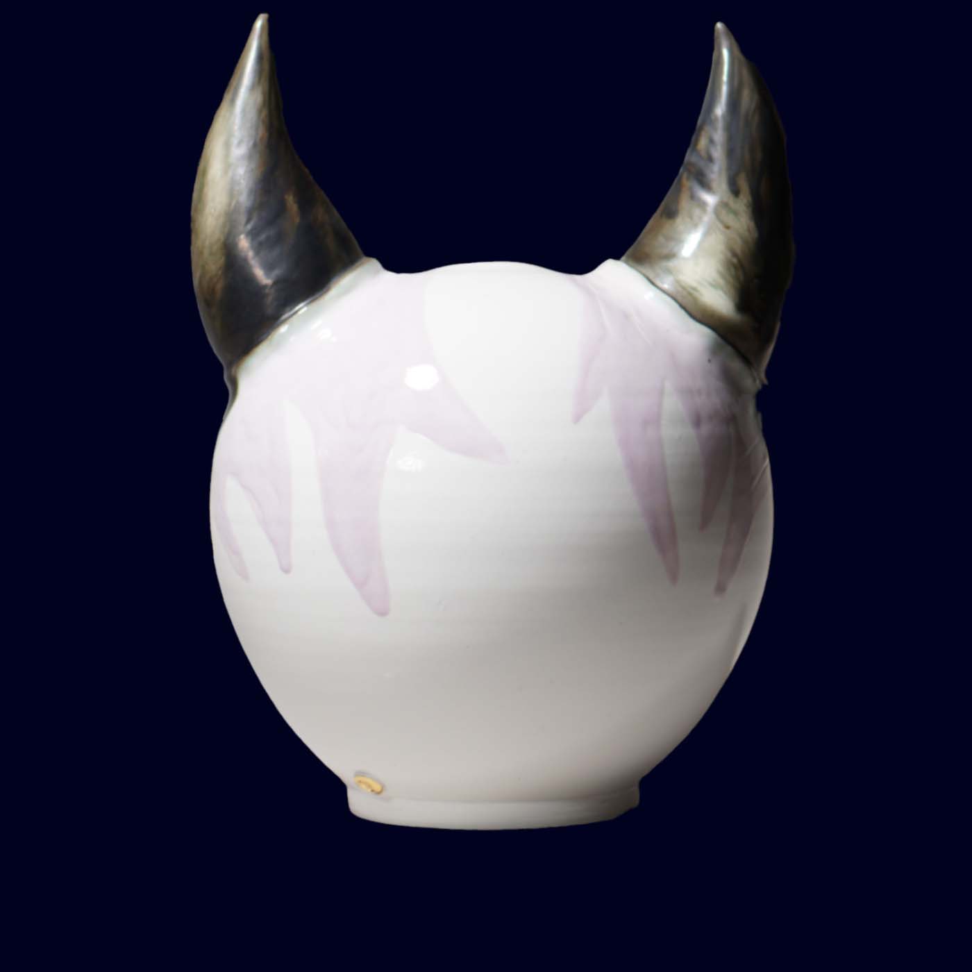 Dogabi Sculptural Jar No. 3 emerges like a vision from another realm—its single golden eye gleaming under curved horns, its face alive with both menace and delight. Hand-thrown and sculpted by Hyung Jun Kim at THR Studio in South Korea, this one-of-a-kind work embodies the playful ferocity of the Dogabi spirit. The swirling blue beard motif and glistening ivory glaze give it a dynamic presence, as though the figure might break into laughter—or a roar—at any moment.