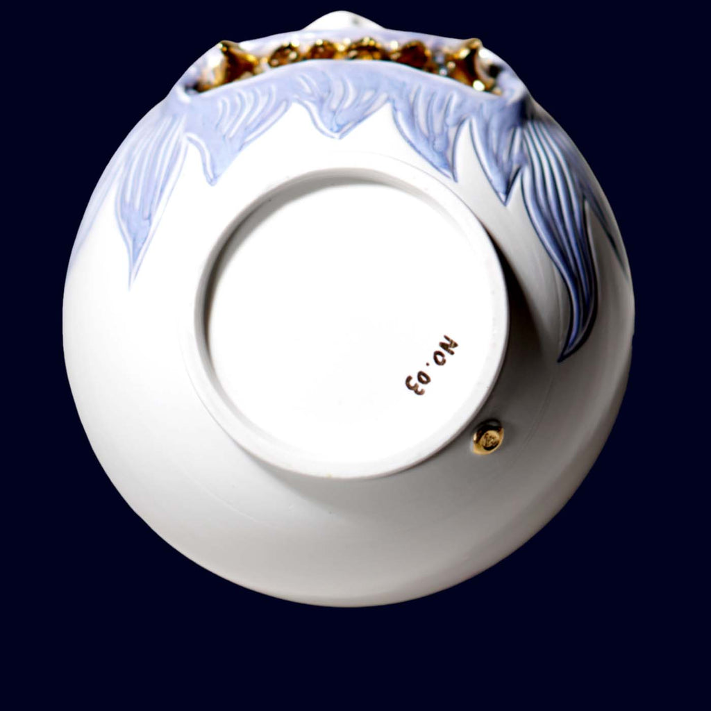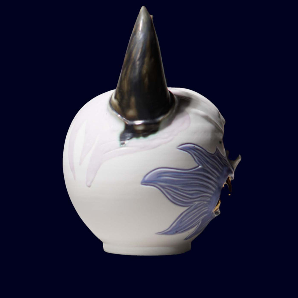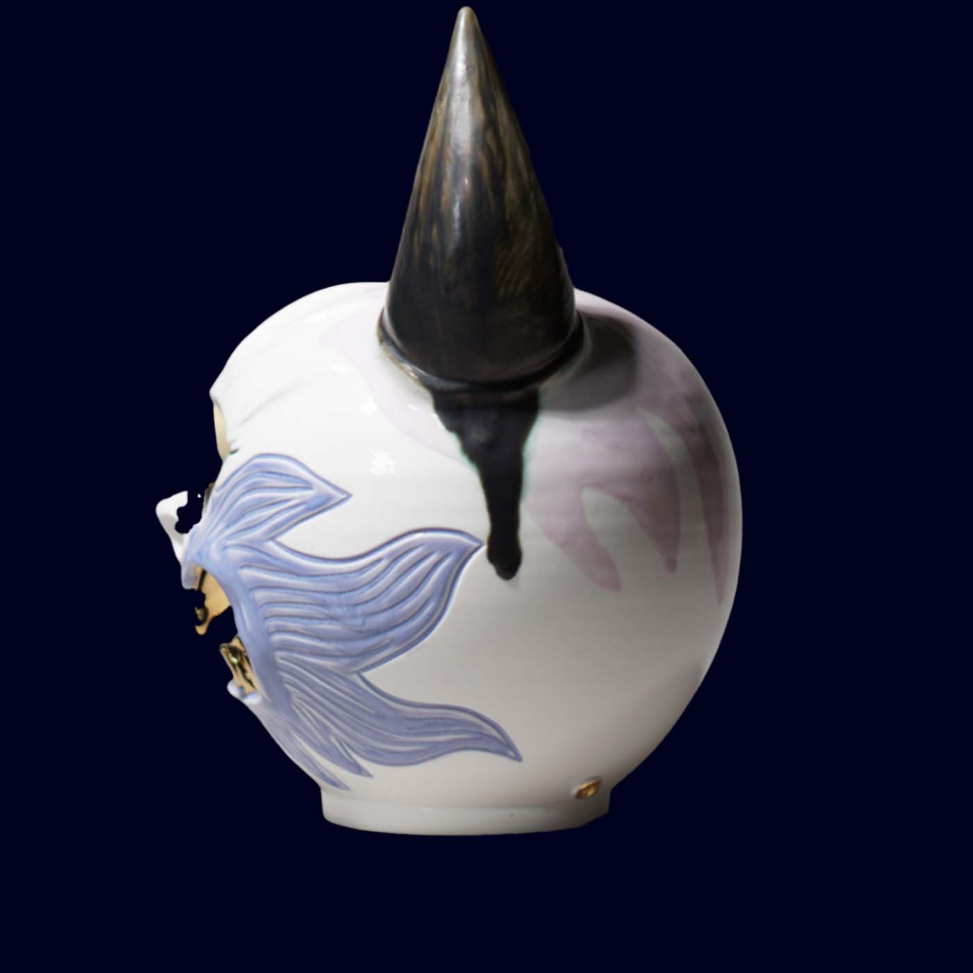 Thrown and carved from a proprietary clay developed at THR Studio, the piece combines precision craftsmanship with unpredictable alchemy. High-temperature oxidation firing at 2,282 °F produces subtle tonal shifts, while the 23.5 K gold accents and hand-painted detailing lend it a supernatural glow.
