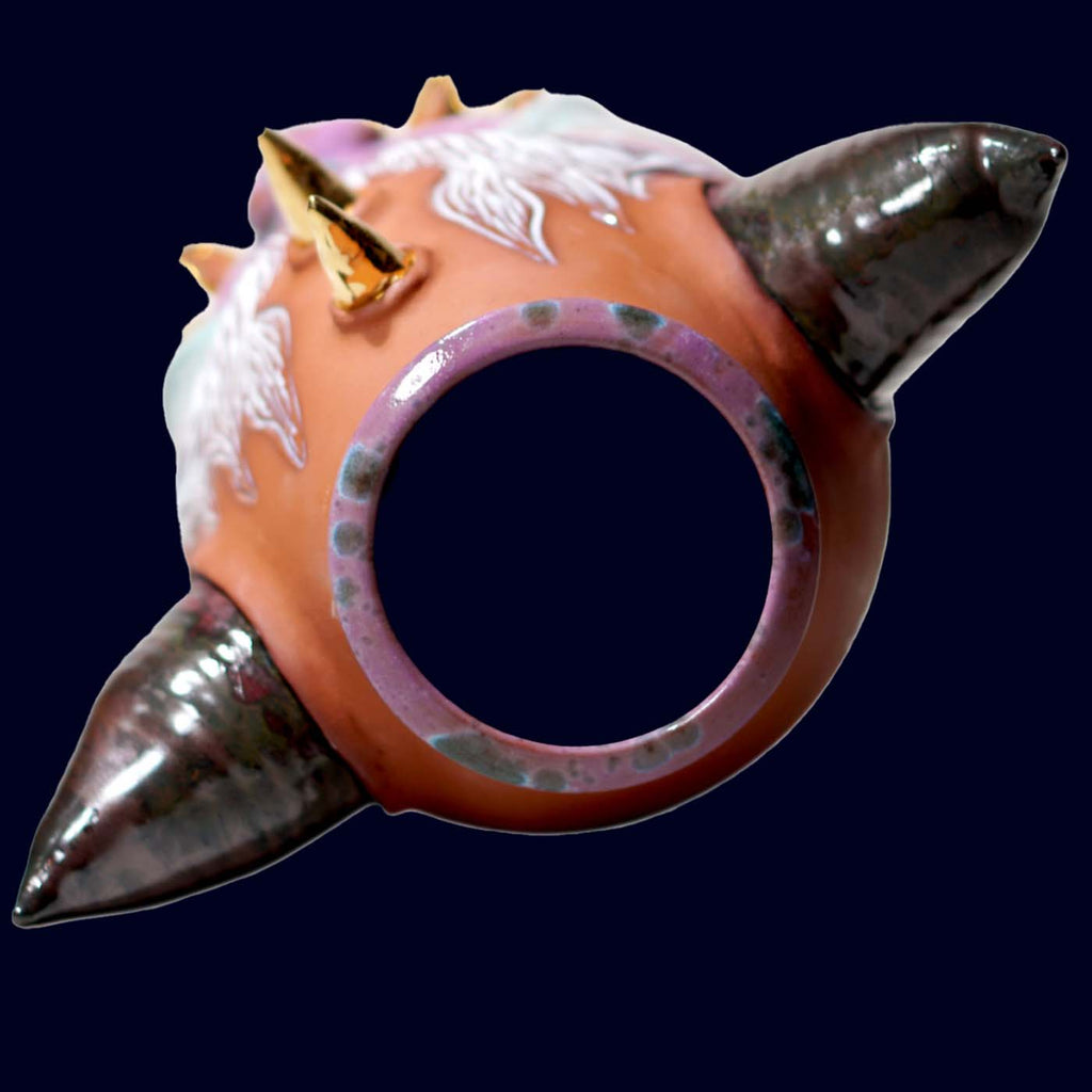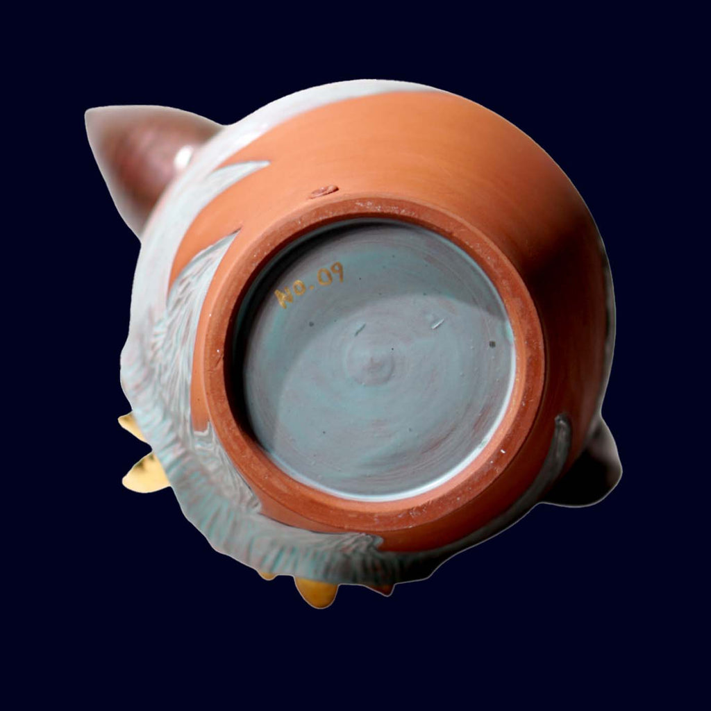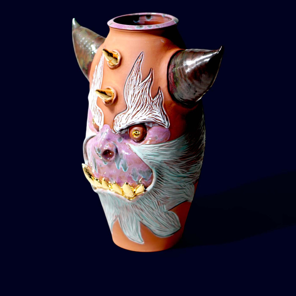 No. 9 demonstrates Kim’s mastery of scale and glaze chemistry. Fired twice—first at 2,012 °F for strength, then again at 1,472 °F to set the surface—it bears the unpredictable beauty of oxidation firing. 23.5 K British gold accents emphasize its eyes and teeth, bringing the mythic creature to life with a molten gleam.