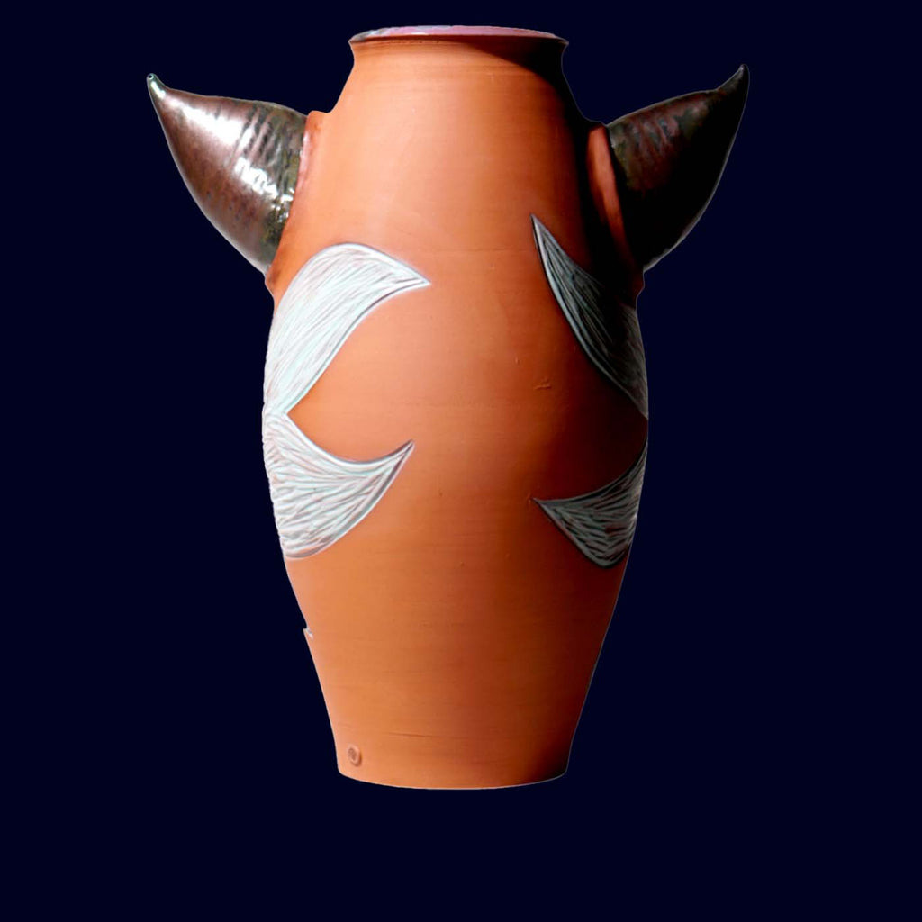The rich terracotta body, layered with lavender and white glazes, shimmers with a metallic luster that reveals new moods under changing light. Fierce and playful at once, this Dogabi feels halfway between a mountain deity and a dream.