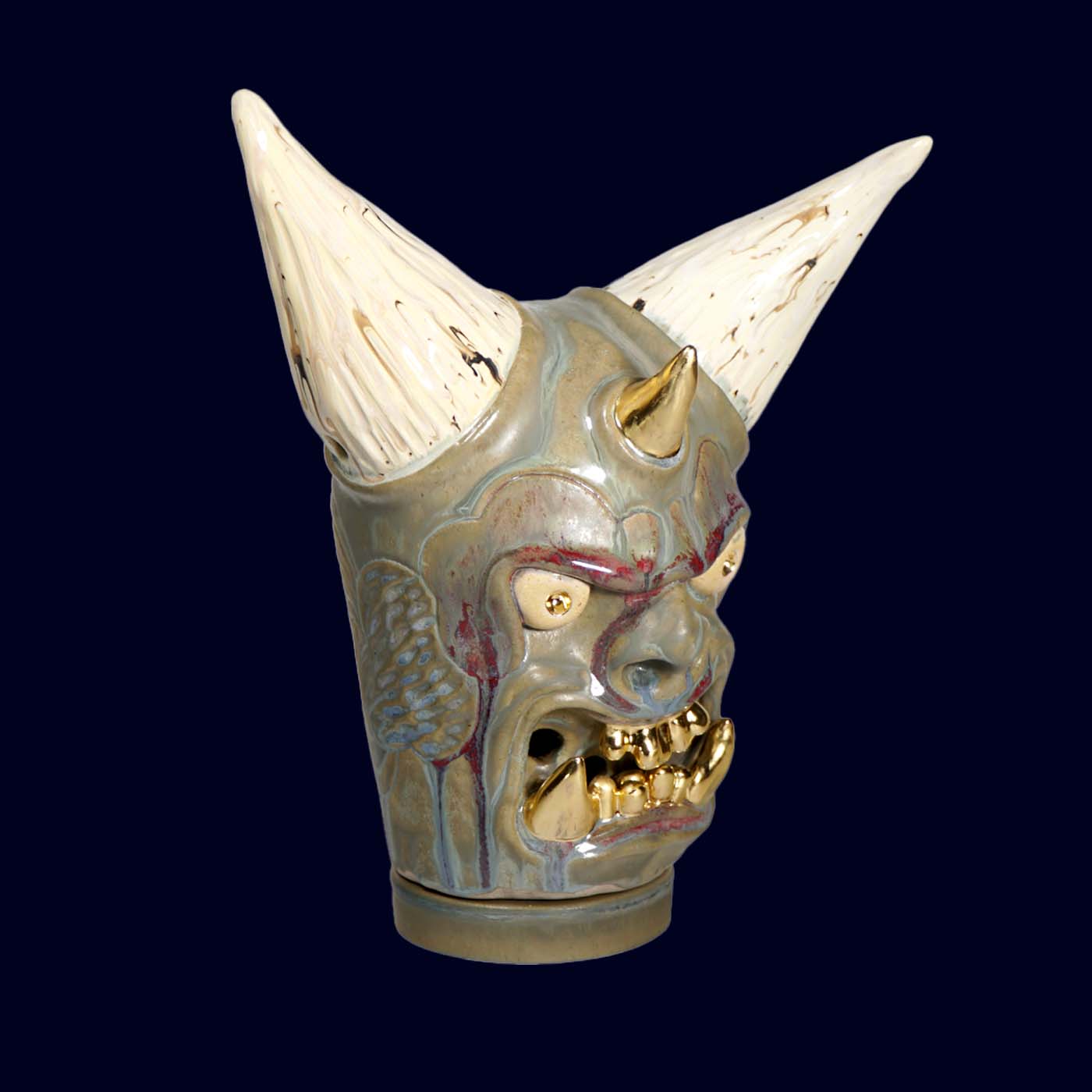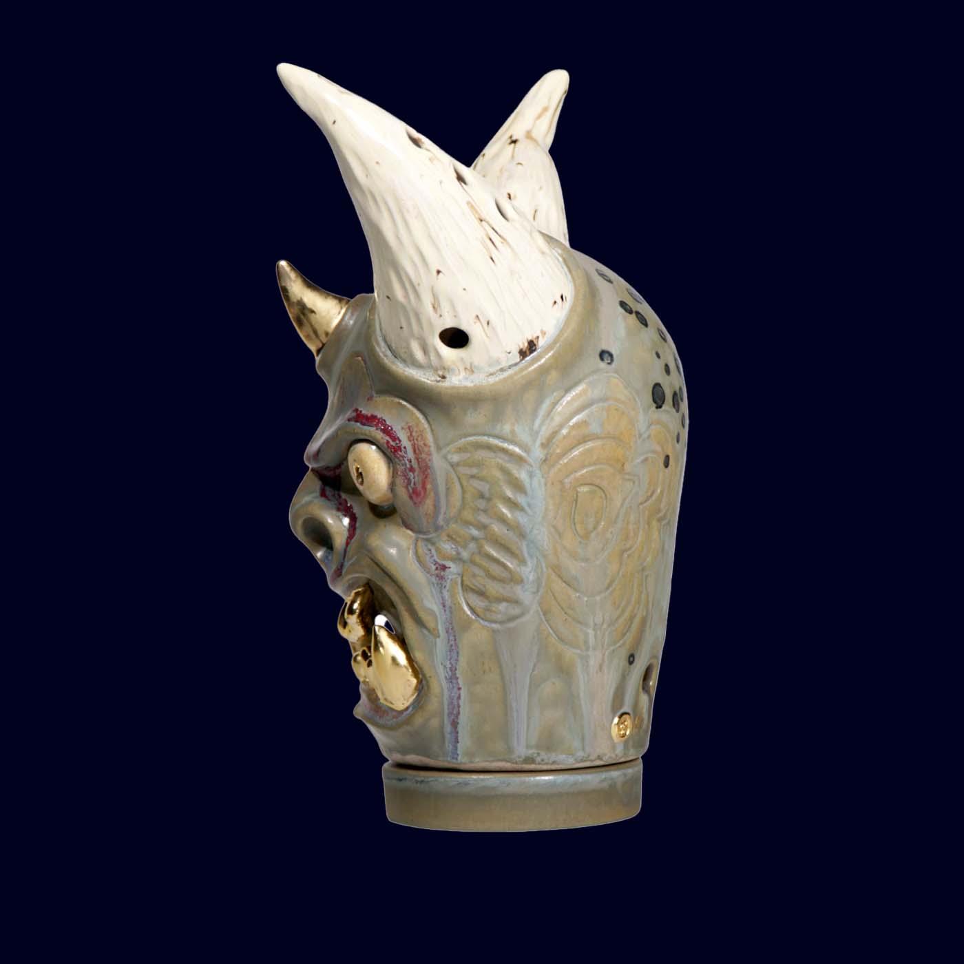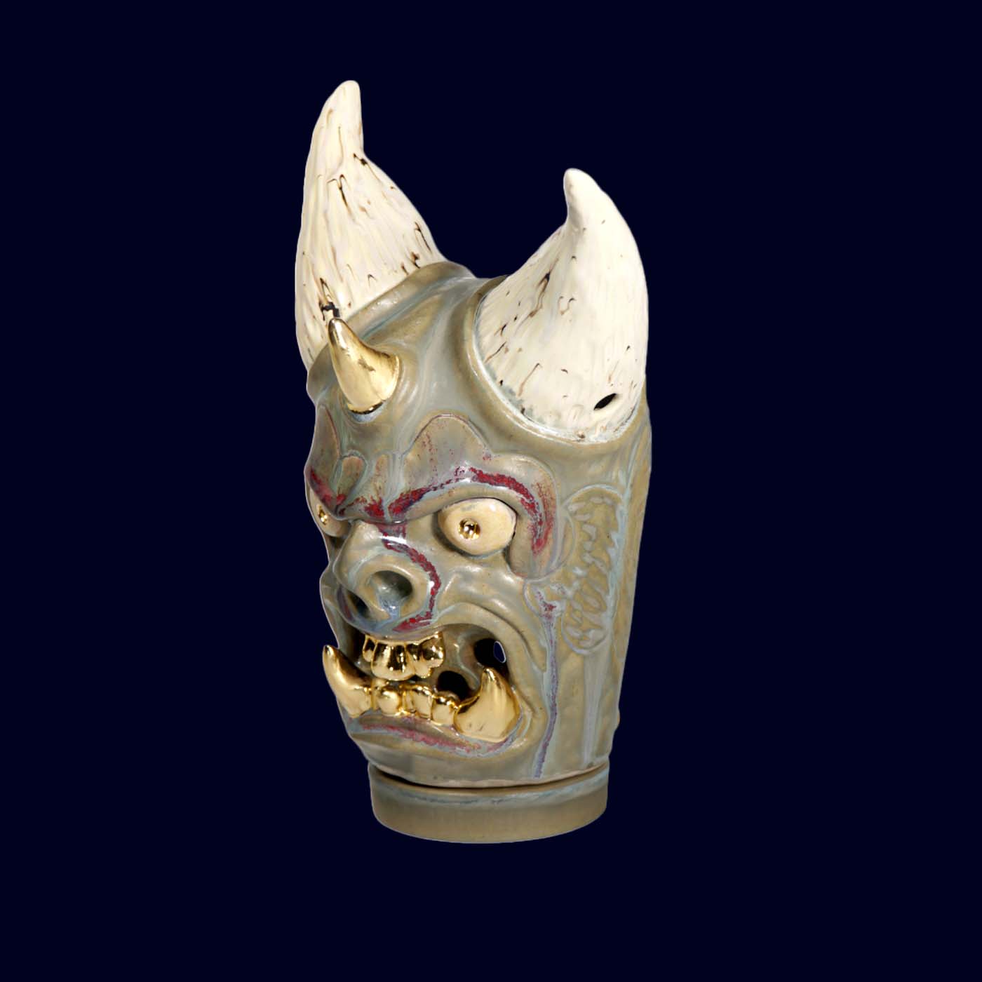 Dogabi No. 337 has the presence of a serious guardian — tall horns, gold teeth, and a gaze that suggests it has already seen the year ahead and is unfazed. Larger than the earlier Dogabi incense burners, this piece feels decidedly sculptural: a ceremonial head with pale textured horns, a central horn on the brow, and soft gray-green glaze layered with subtle color shifts. There is humor in the raised brow and the gleam of gold, but it is the calm confidence that lingers.