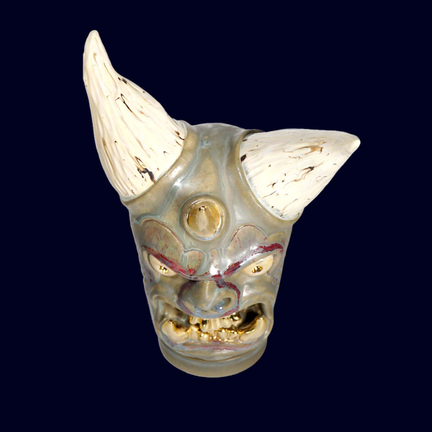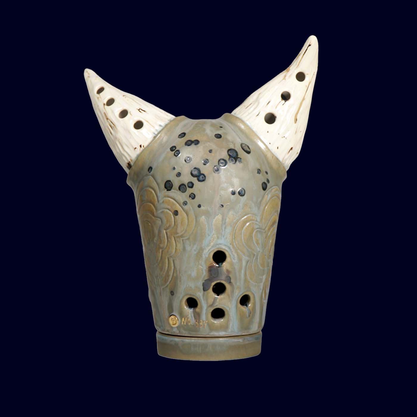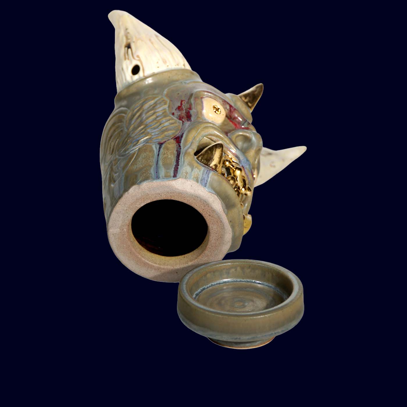 Dogabi No. 337 has the presence of a serious guardian — tall horns, gold teeth, and a gaze that suggests it has already seen the year ahead and is unfazed. Larger than the earlier Dogabi incense burners, this piece feels decidedly sculptural: a ceremonial head with pale textured horns, a central horn on the brow, and soft gray-green glaze layered with subtle color shifts. There is humor in the raised brow and the gleam of gold, but it is the calm confidence that lingers.
