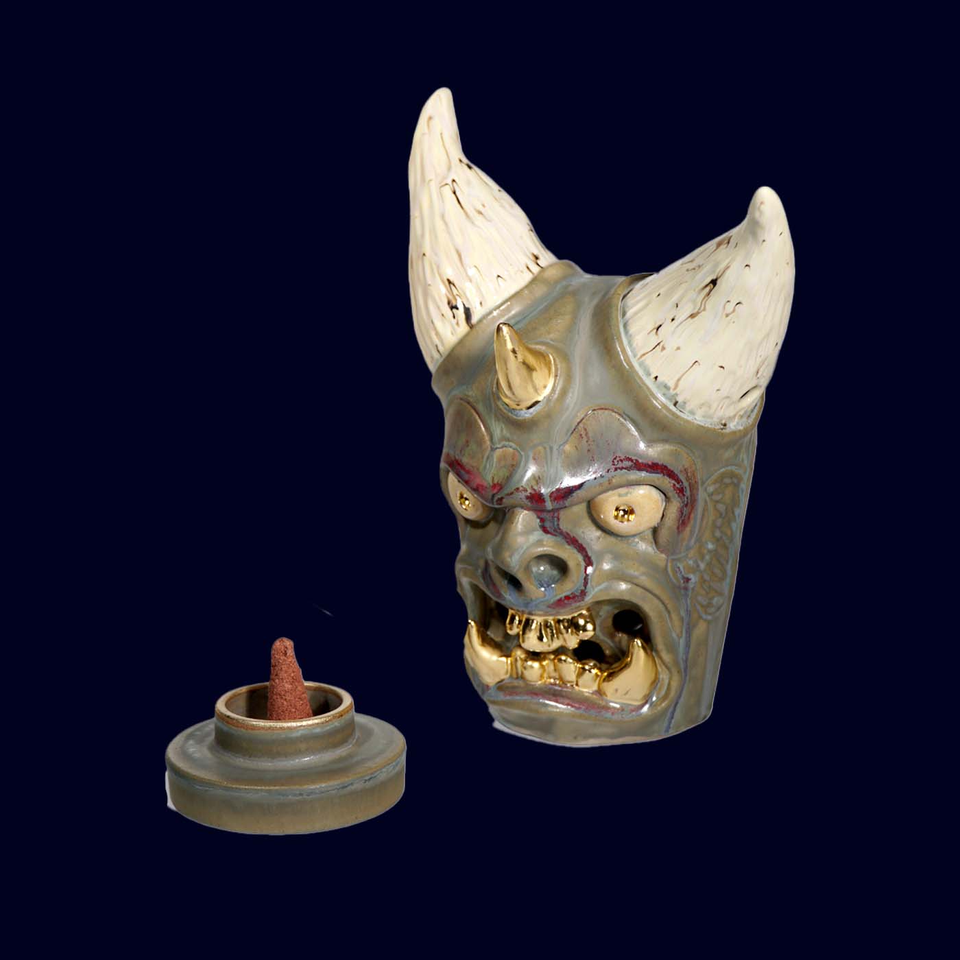 This burner works with both stick and cone incense. Smoke drifts through the open mouth and teeth, animating the face as it burns. Use it, or simply let it exist as an object — it holds a room either way.