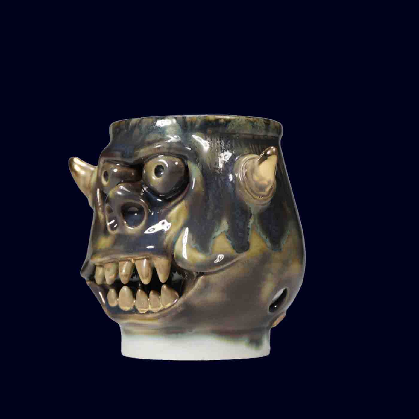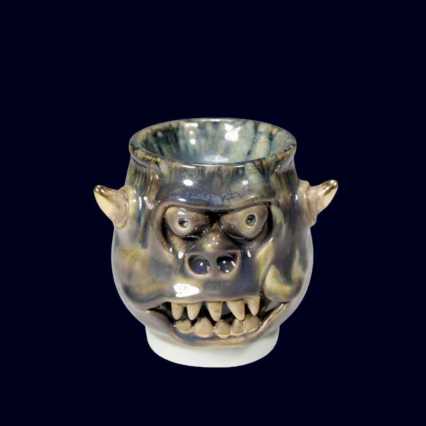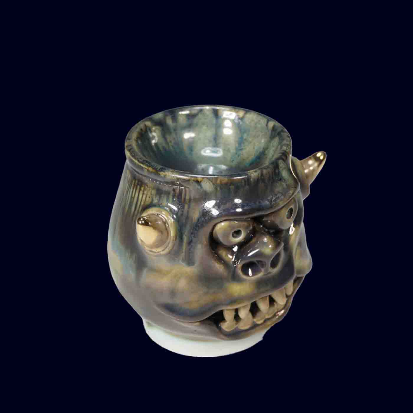 Dogabi Essential Oil Burner No. 29 is a creature with opinions. Sculpted from white porcelain and finished in a smoky, storm-blue glaze, it carries a beautifully intense expression — wide eyes, a snarling grin, and horns gilded in British 23.5k gold. It’s equal parts guardian spirit and functional object.