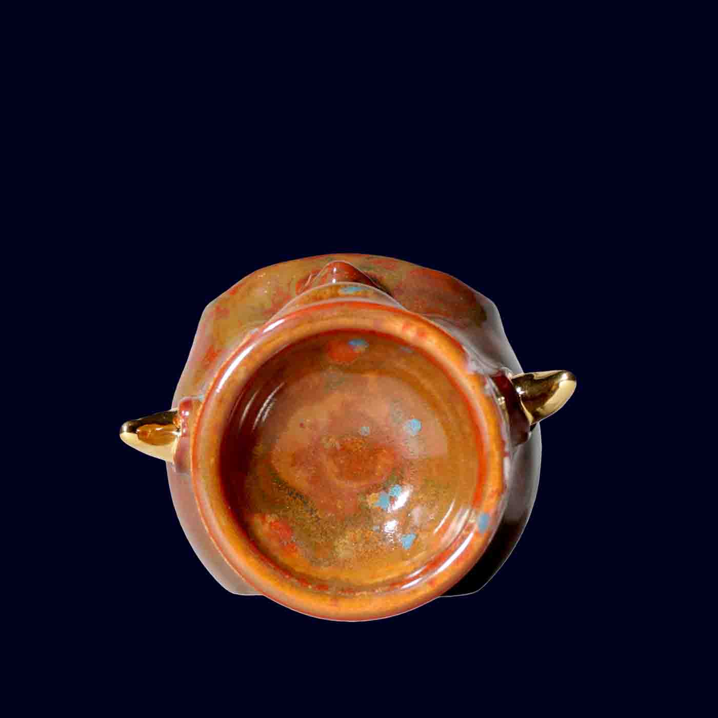 The glaze is extraordinary here: a layered mix of rust-red, ember-orange, and mineral flashes of blue that shift as the light moves. At the back, a circular opening reveals the chamber for a tea light candle; on top, a 22mm-deep bowl holds a few drops of essential oil. Once lit, the inner flame animates the entire face, turning it into a tiny guardian radiating scent and a warm, flickering glow.