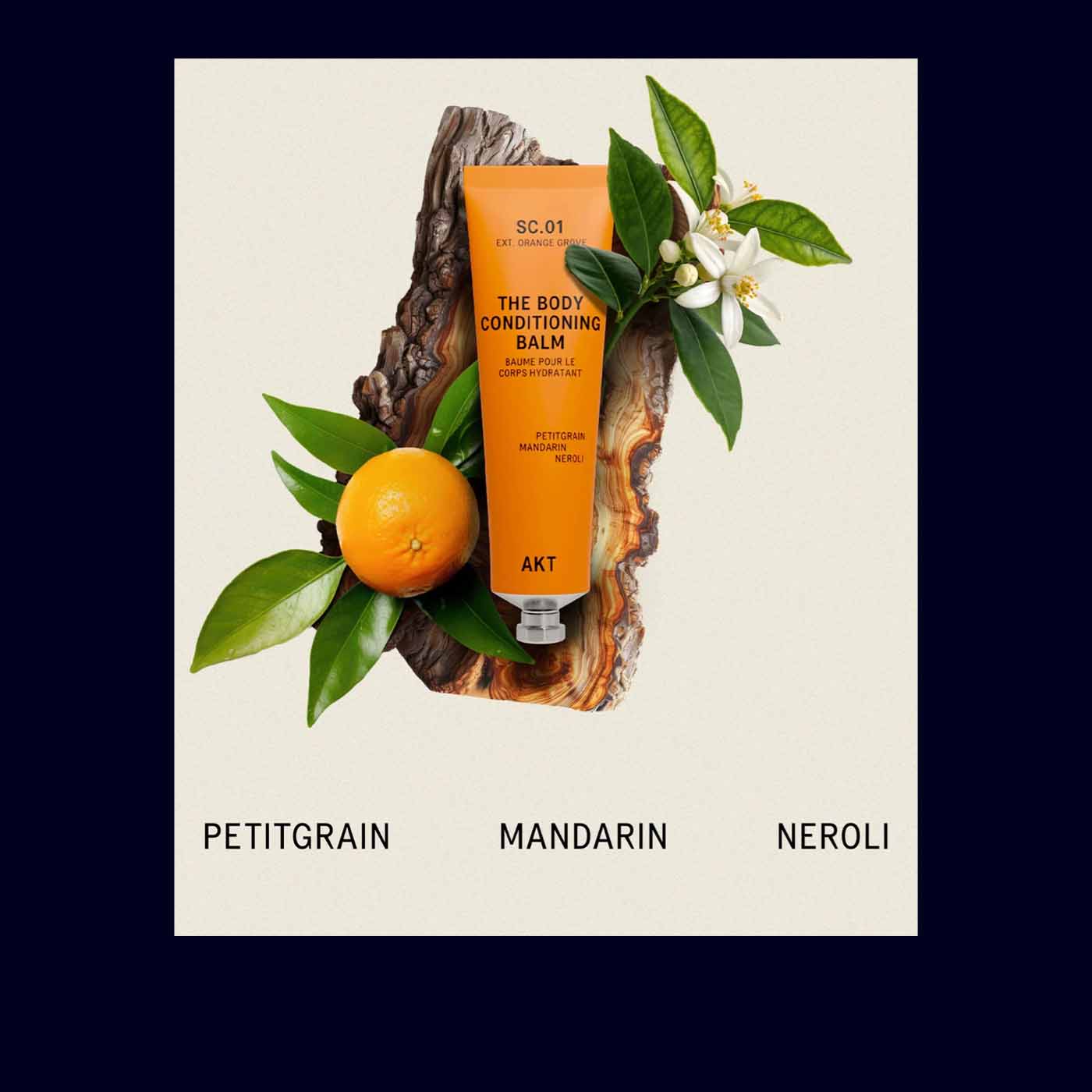 SC.01 Orange Grove carries the same scent as its siblings in the AKT lineup — petitgrain, mandarin, and neroli, with the faint bitter edge of a Negroni underneath and Italian cypress in the dry-down. Applied after a shower, the fragrance has room to open properly on warm skin. It lingers, quietly.