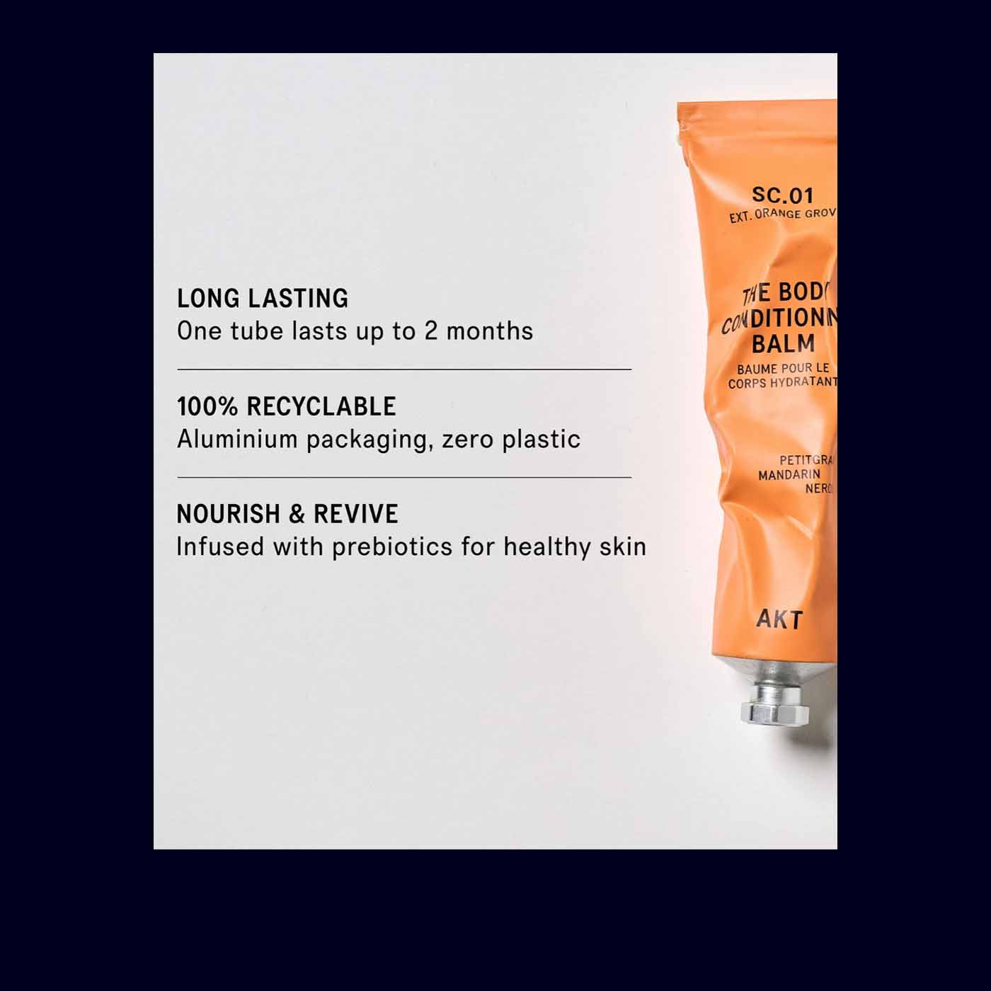 AKT is a London-based body care label that started with a peculiar obsession: making natural deodorant that actually worked, and that smelled worth talking about. The same rigor carried into body care — each product developed over years, tested seriously, formulated to perform rather than just promise. The scent identities are conceived as scenes rather than fragrance names: Orange Grove is not just citrus, it's a specific hour of a specific afternoon. That specificity runs through everything AKT makes.