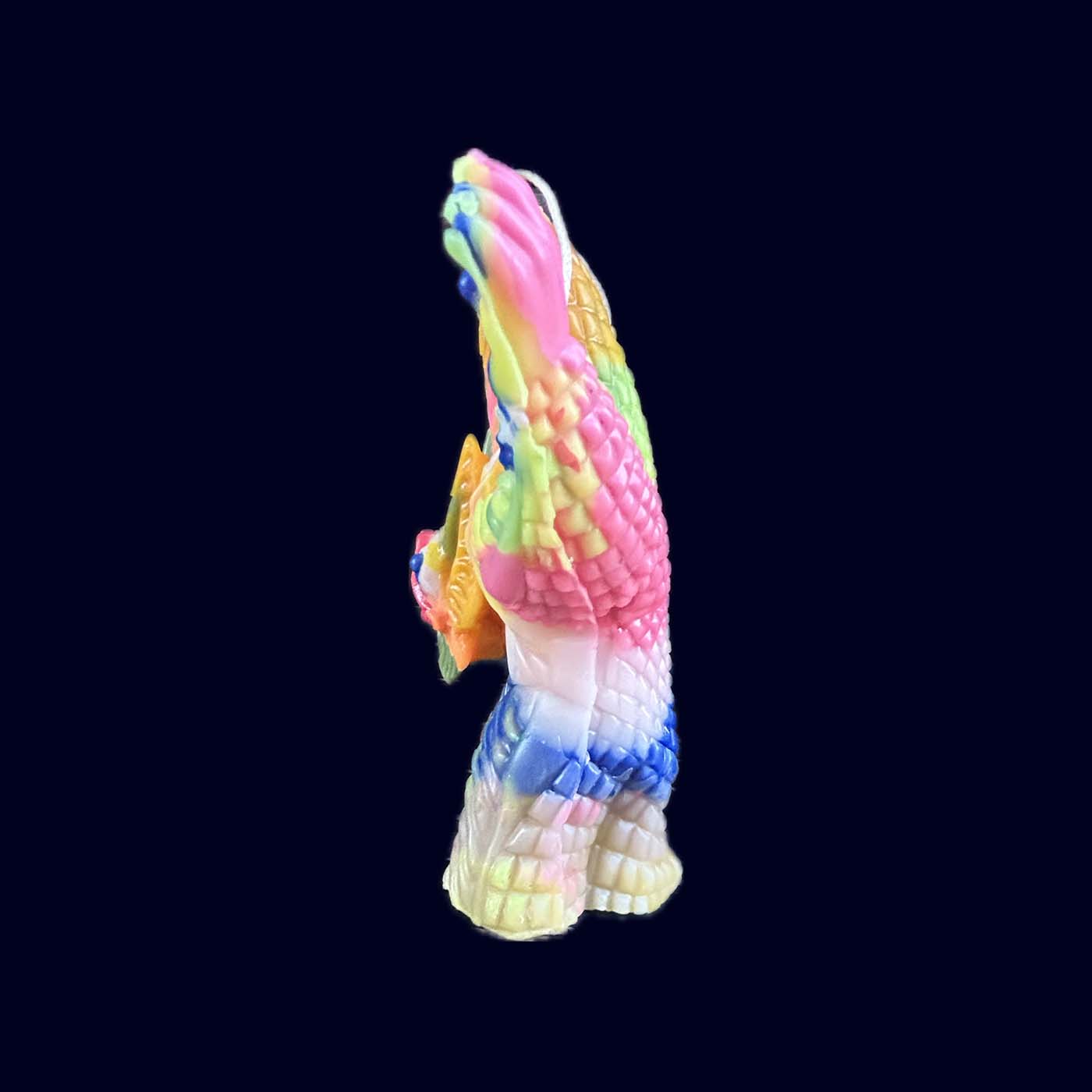 This Alice arrives mid-celebration. Wings thrown wide, colors colliding—sunset yellow, bubblegum pink, sky blue, seafoam, and flashes of cobalt—like a dragon who flew straight through a parade and never looked back.