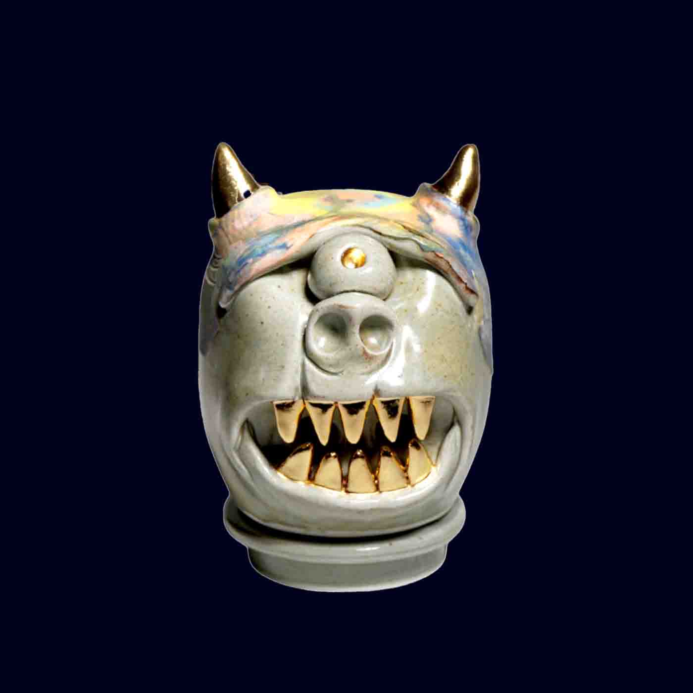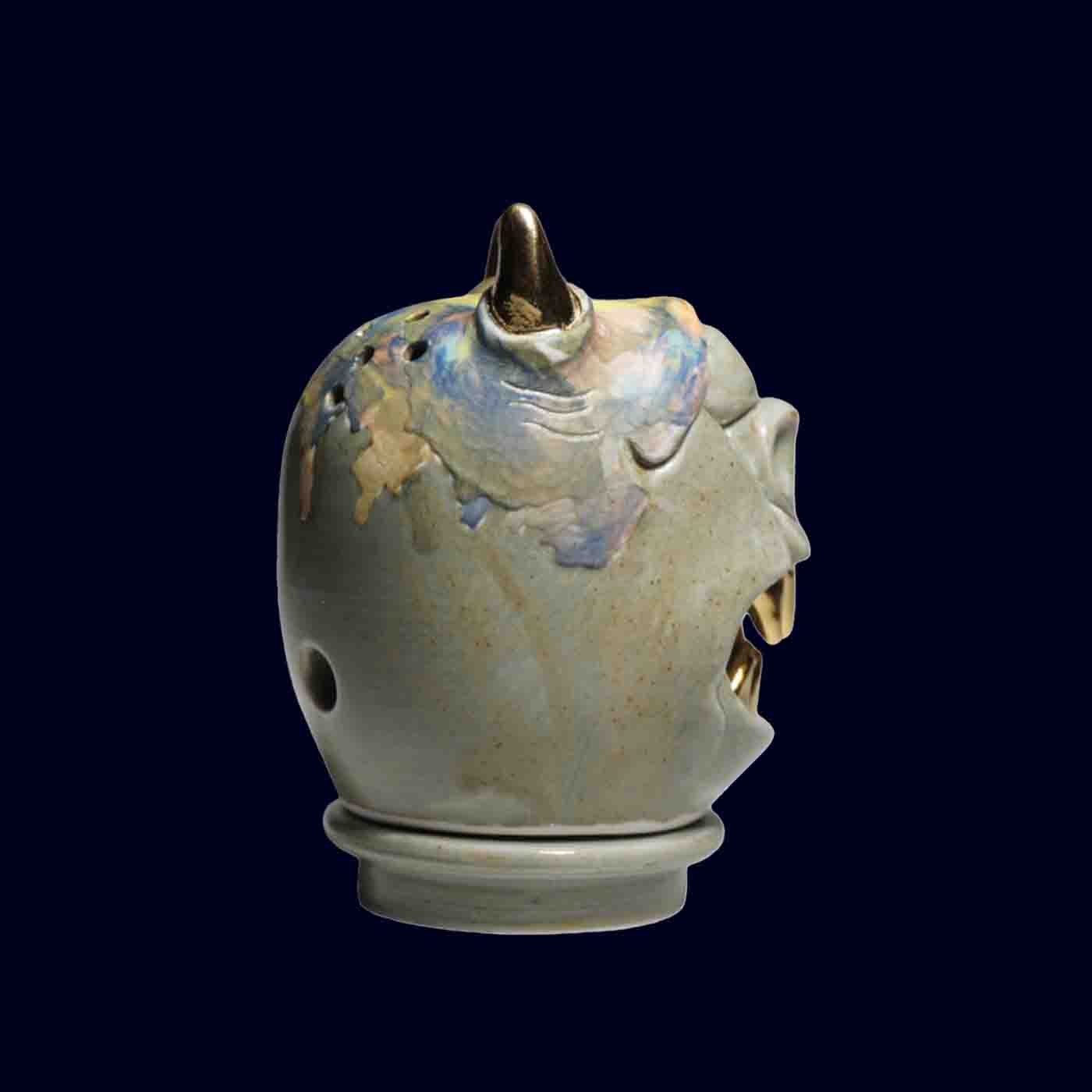 Dogabi Incense Burner No. 307 embodies the whimsical defiance of Korea’s dokkaebi — a guardian spirit known to delight, protect, and occasionally cause a little trouble. Hand-thrown in white porcelain and sculpted with pierced openings, this one-eyed goblin features soft celadon hues, a wash of pastel glaze across its brow, and gleaming 23.5 k gold teeth and horns. When incense burns within, smoke rises through its open mouth and nostrils, giving the impression that the Dogabi itself is exhaling with satisfaction.