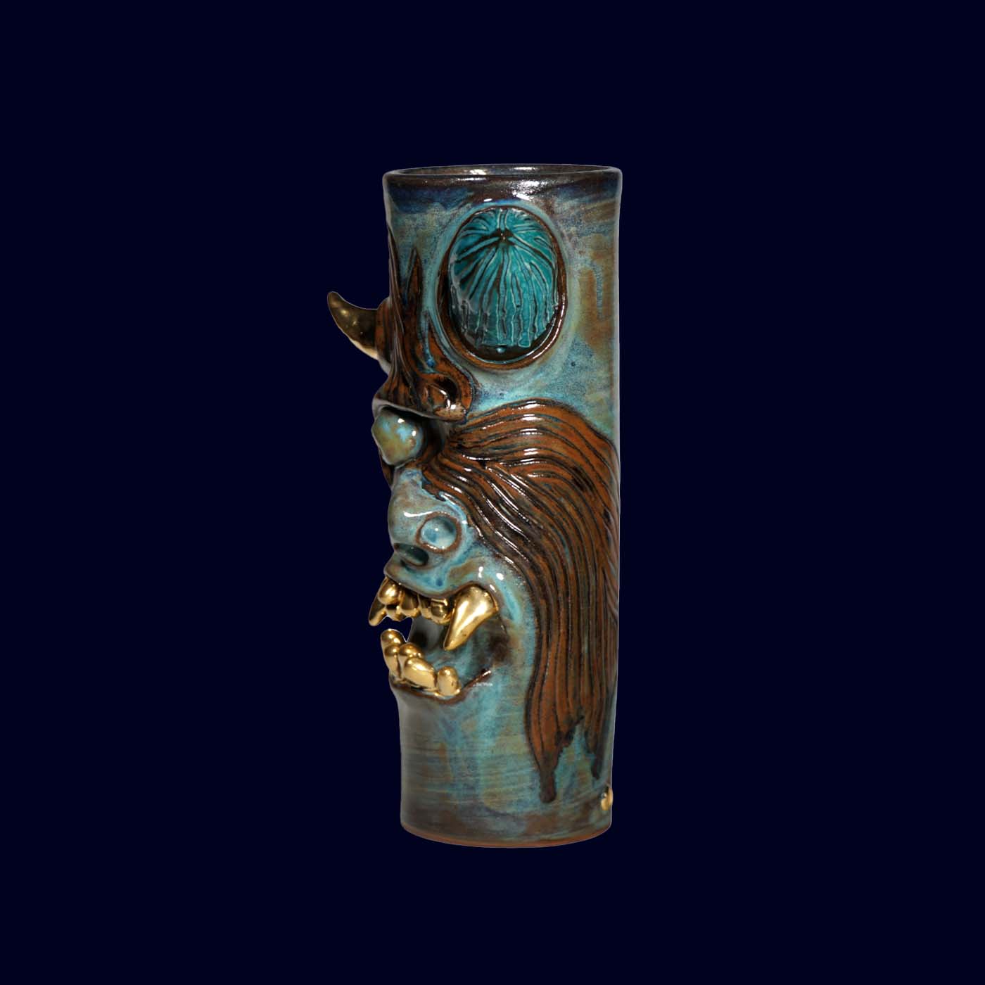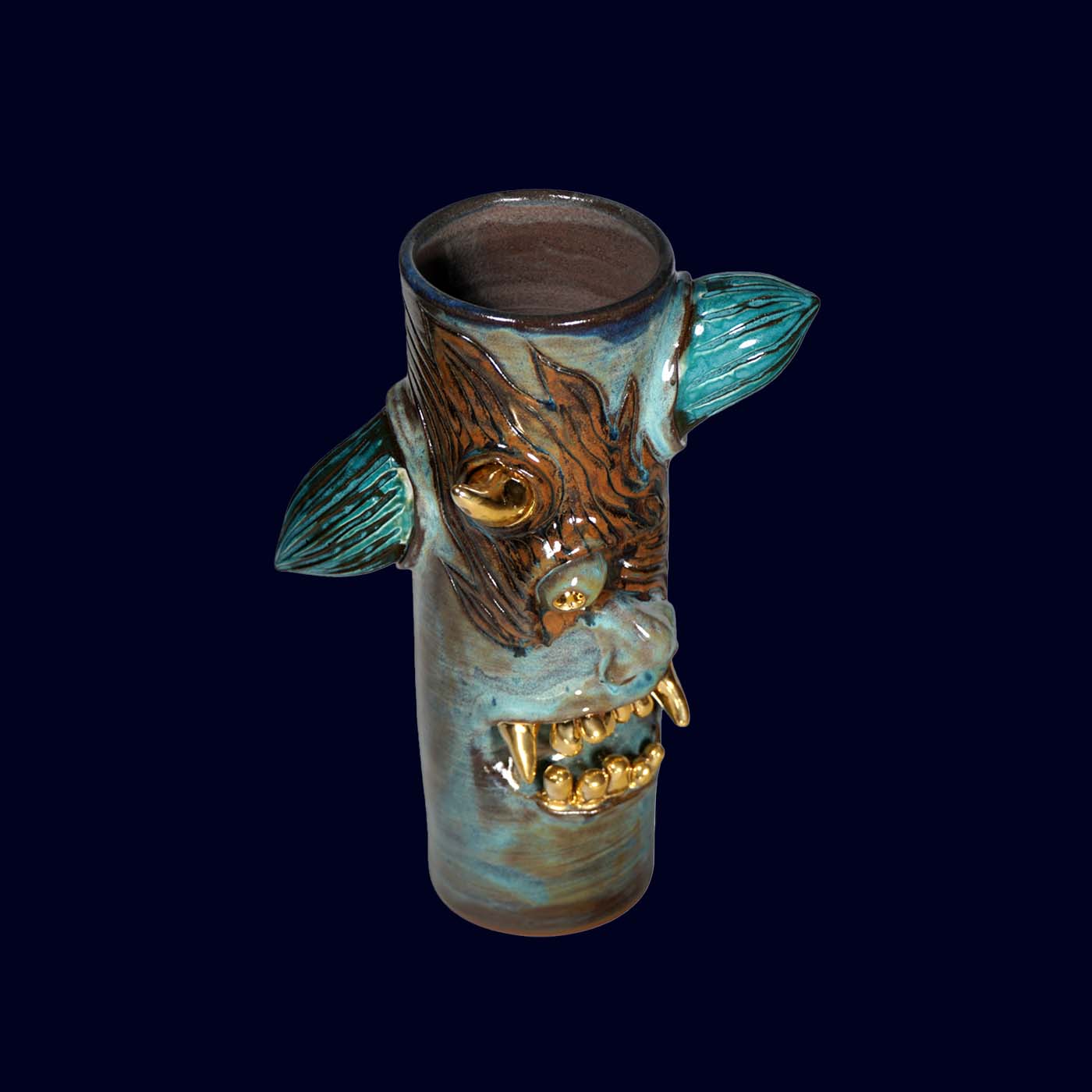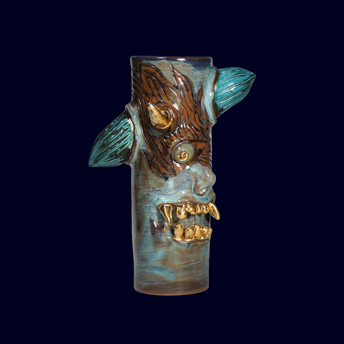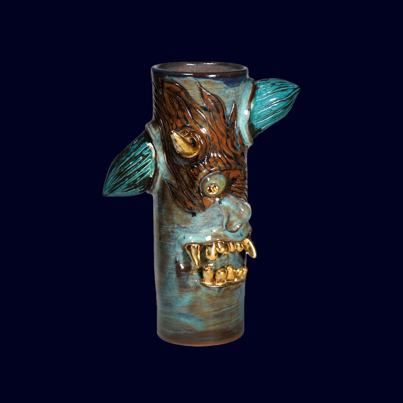 Dogabi No. 306 is a tall, totem-like flower vase with a wonderfully strange personality. With a single golden eye, pointed ears, and a mouth full of 23.5k gold teeth, it feels like a forest spirit emerging from a tree trunk. It has presence even when empty, and when holding branches or flowers it turns into a small scene — the blooms becoming hair, antlers, or thoughts depending on what you place inside. Taller than many of the earlier Dogabi vases, this one stands confidently on its own as both sculpture and vessel.