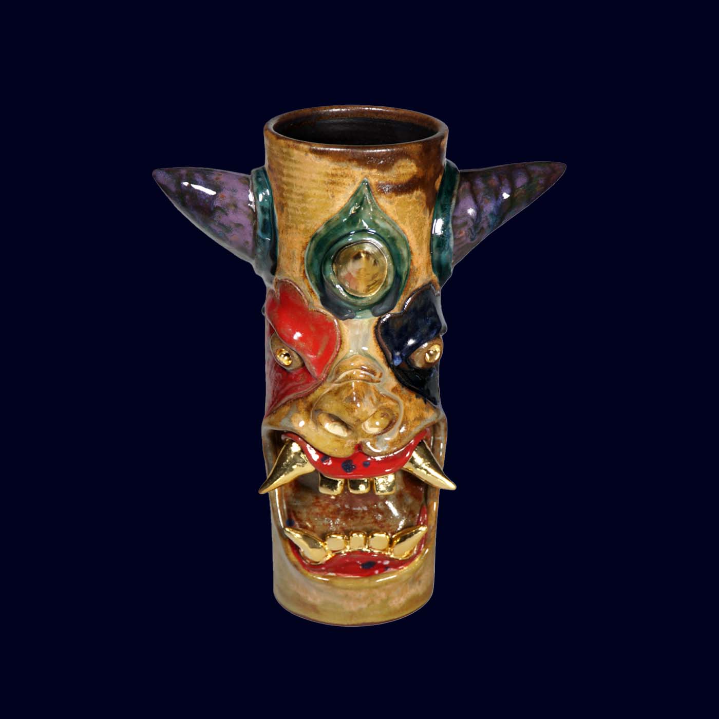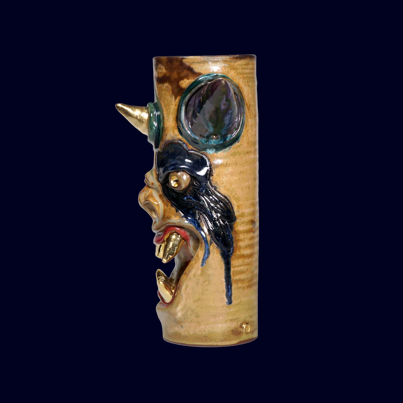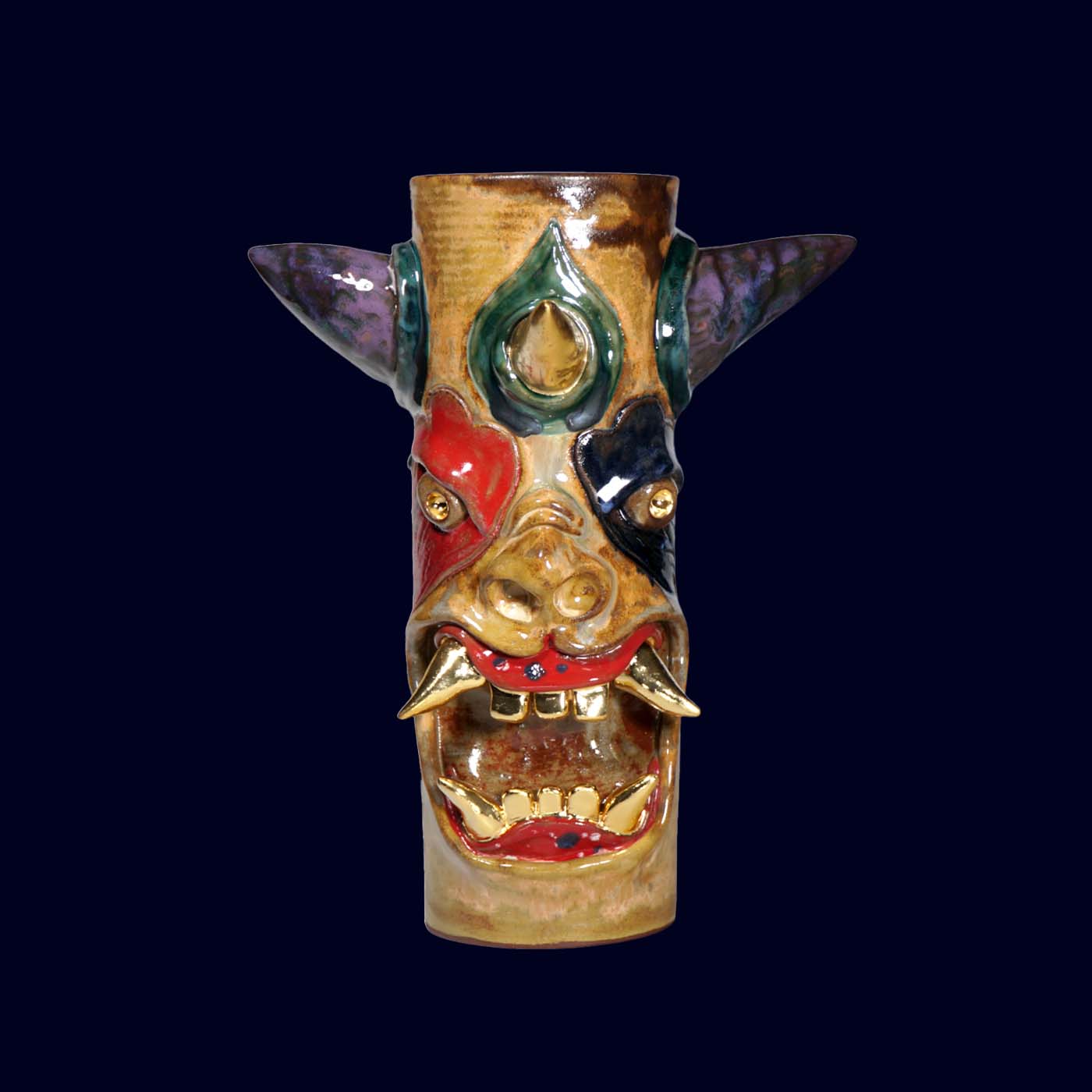 Dogabi No. 307 is a tall, dramatic flower vase with a joyful sense of chaos. With wide, colorful horns, bold multicolored face markings, and a mouth full of 23.5k gold teeth, it feels like a carnival spirit that wandered out of another world. It has strong presence even on its own, and when filled with flowers or branches it becomes a character in motion — the arrangement reading as hair, antlers, or fireworks bursting from its head. Taller than many earlier Dogabi vases, this piece stands as both sculpture and vessel, equally at home on a dining table, entry console, or altar-like shelf.