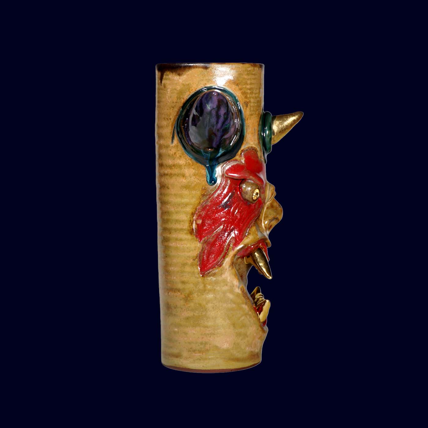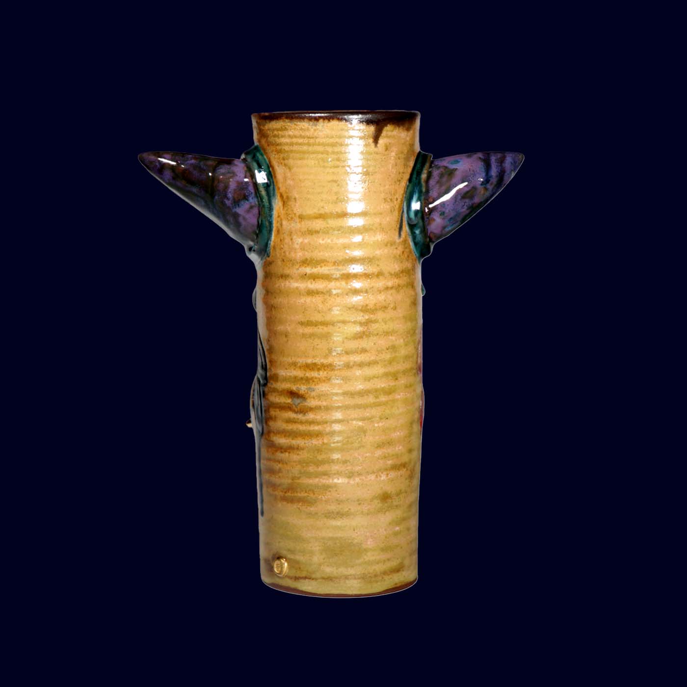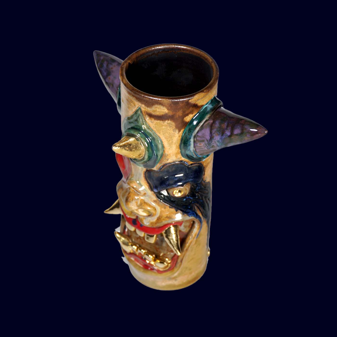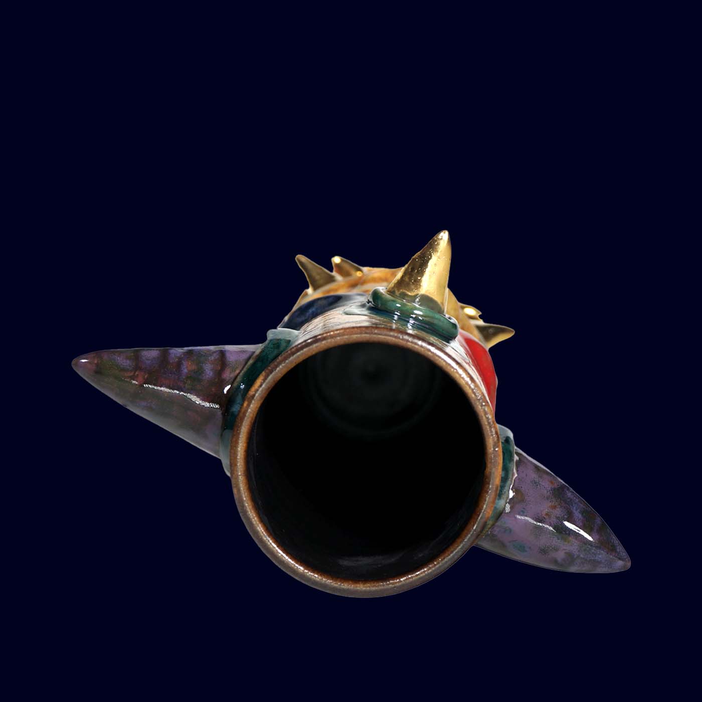 Dogabi No. 307 is a tall, dramatic flower vase with a joyful sense of chaos. With wide, colorful horns, bold multicolored face markings, and a mouth full of 23.5k gold teeth, it feels like a carnival spirit that wandered out of another world. It has strong presence even on its own, and when filled with flowers or branches it becomes a character in motion — the arrangement reading as hair, antlers, or fireworks bursting from its head. Taller than many earlier Dogabi vases, this piece stands as both sculpture and vessel, equally at home on a dining table, entry console, or altar-like shelf.