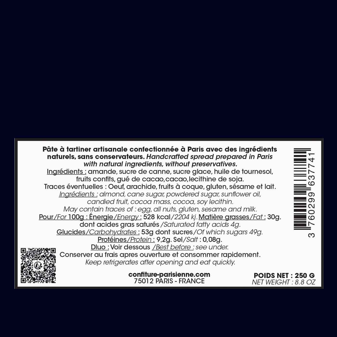 Almond, cane sugar, powdered sugar, sunflower oil, candied fruit (orange & lemon), cocoa mass, cocoa powder, soy lecithin.