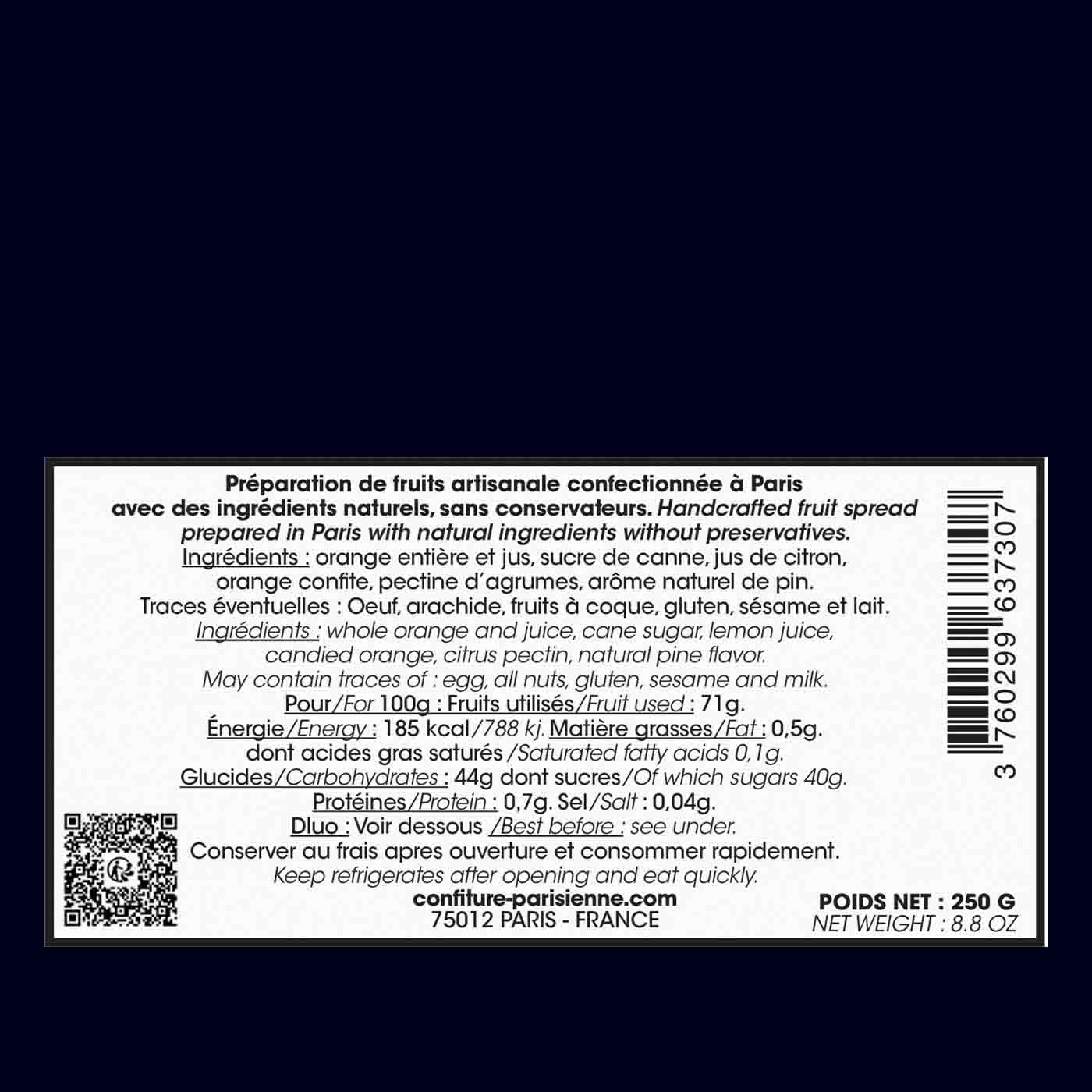 Whole orange and orange juice, cane sugar, lemon juice, candied orange, citrus pectin, natural pine flavor.