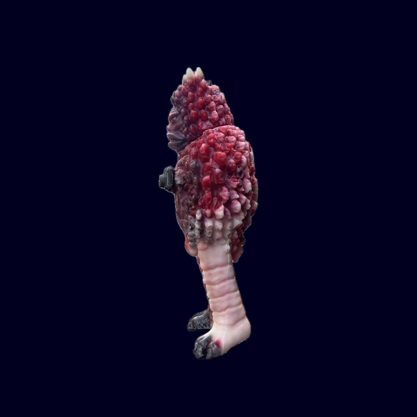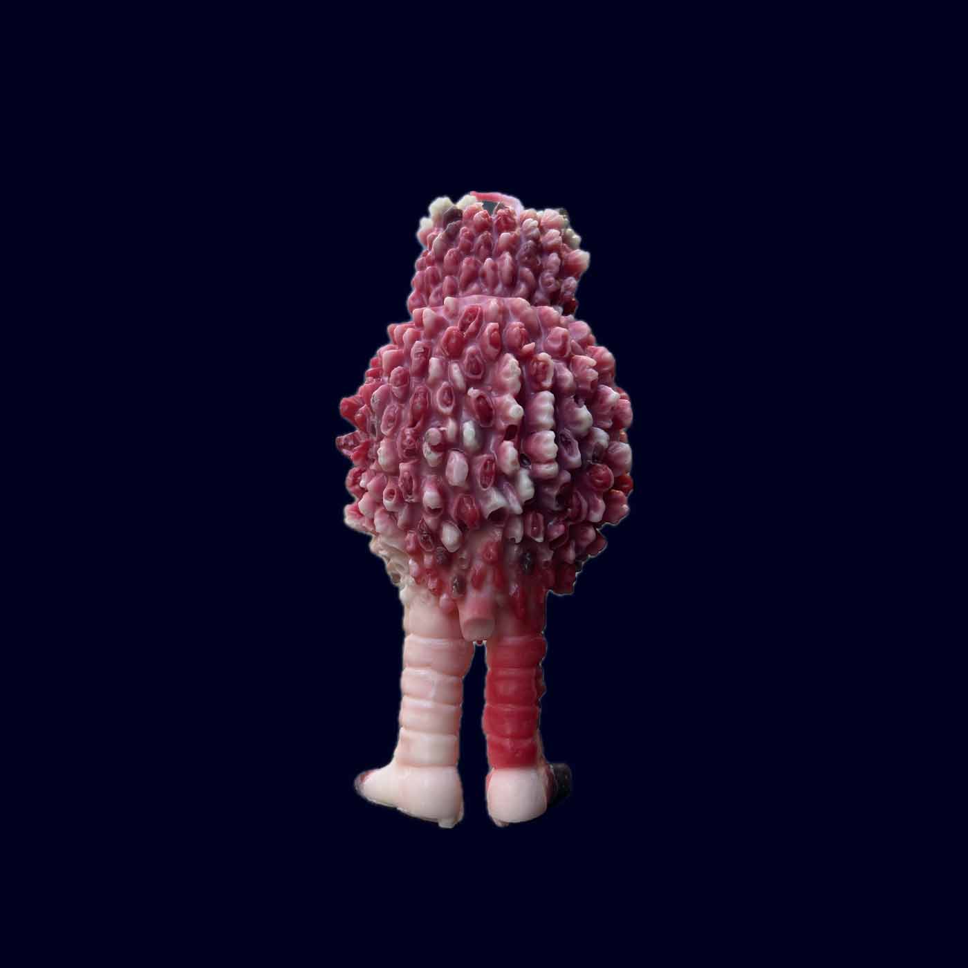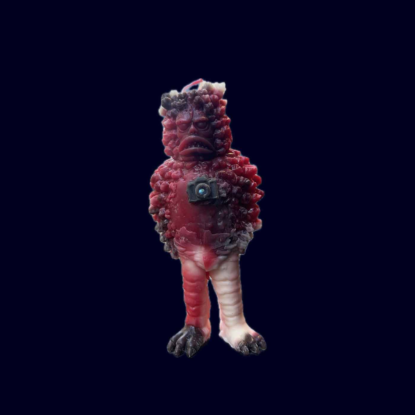 Standing 6" tall, this edition is cast in deep crimson, smoke-charcoal, and bone white tones — as if it walked straight out of a volcanic news cycle. A tiny sculpted camera sits at its chest, transforming the familiar scowl into something observational.