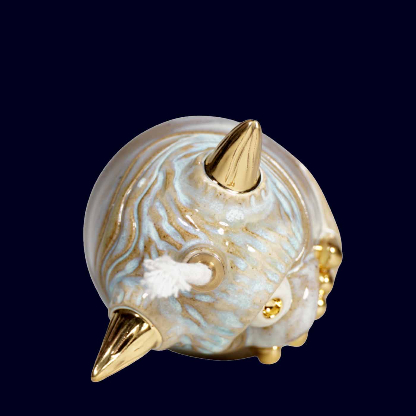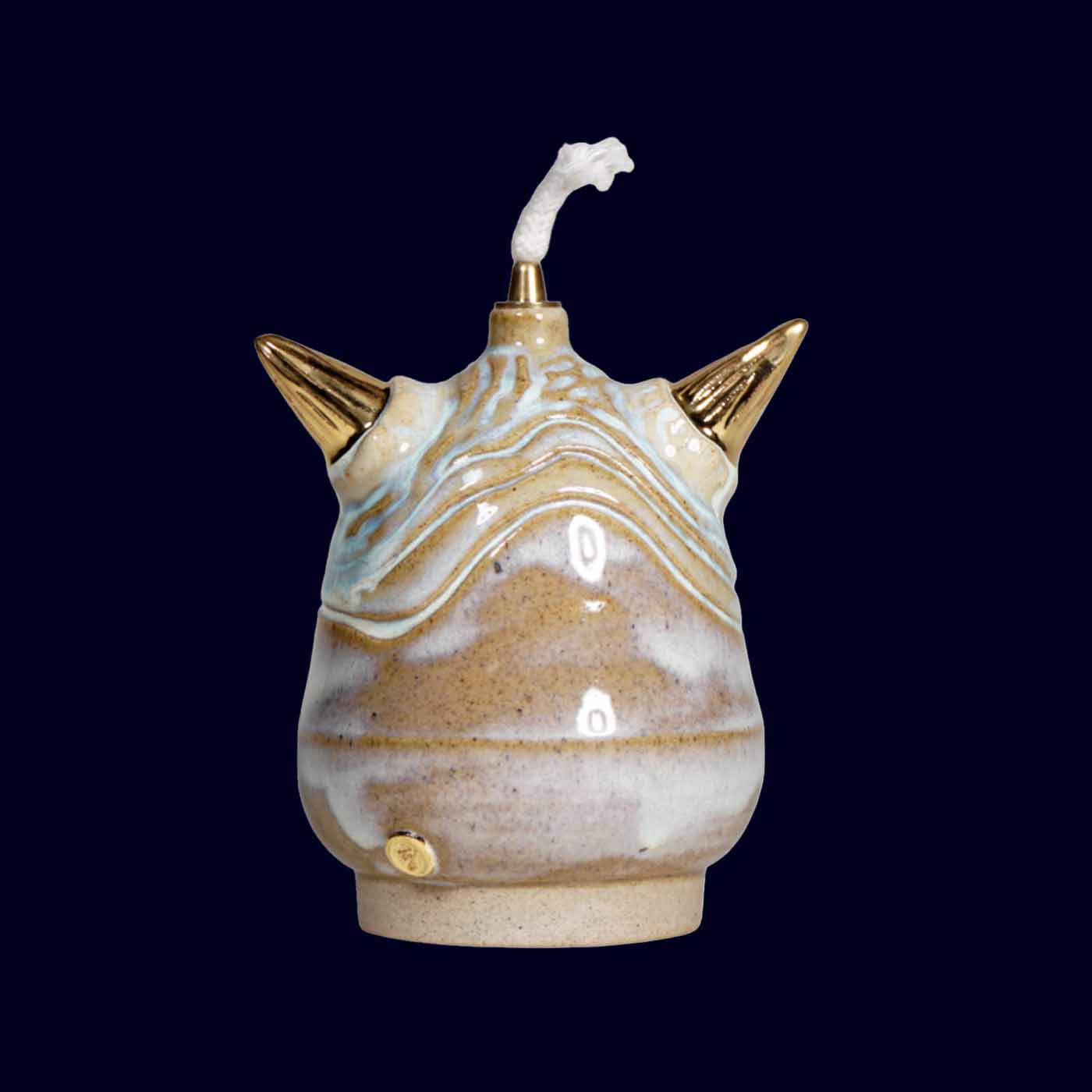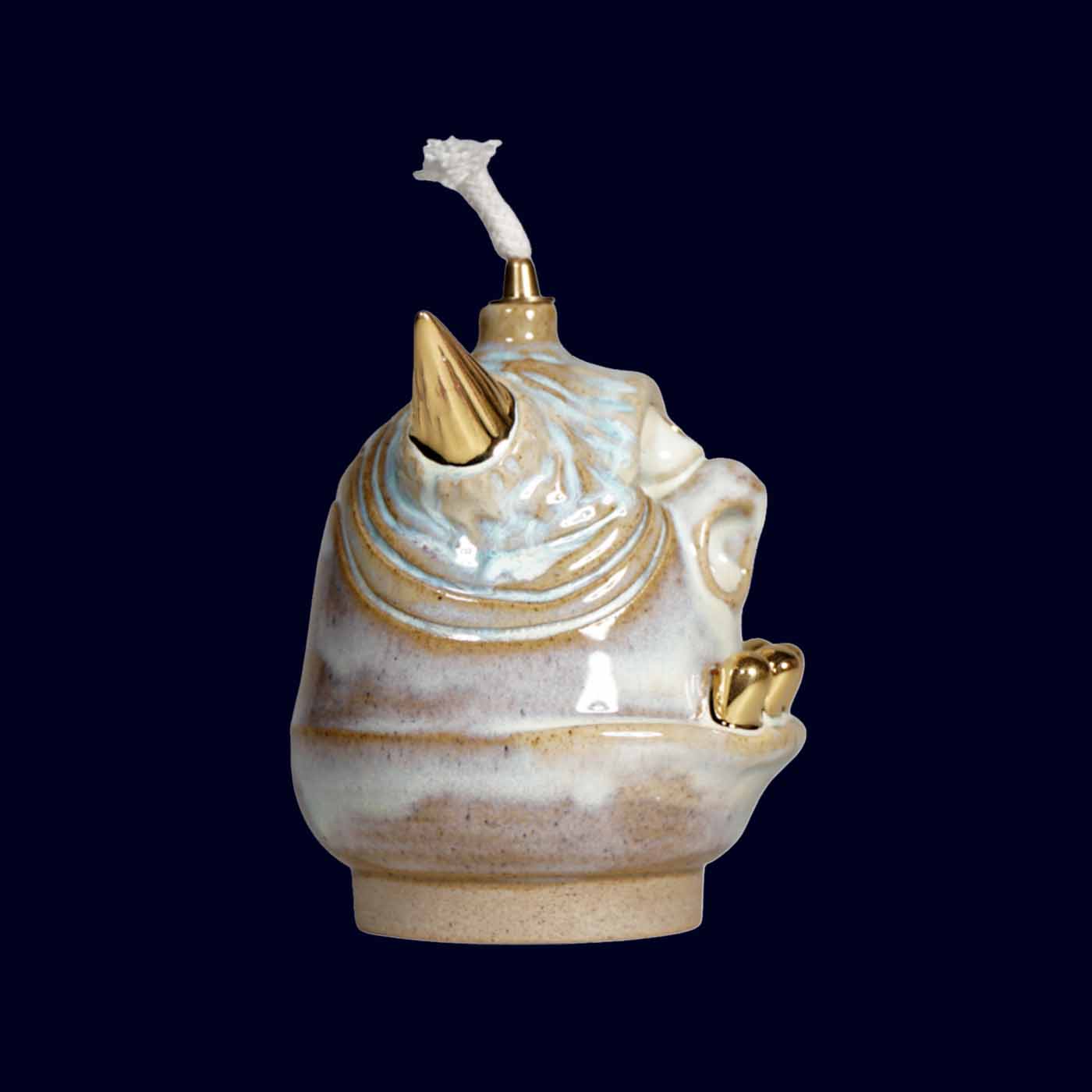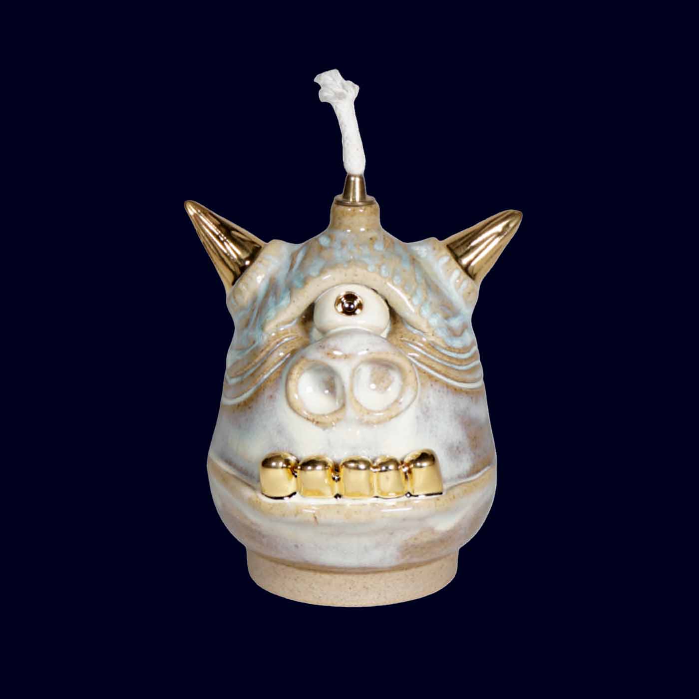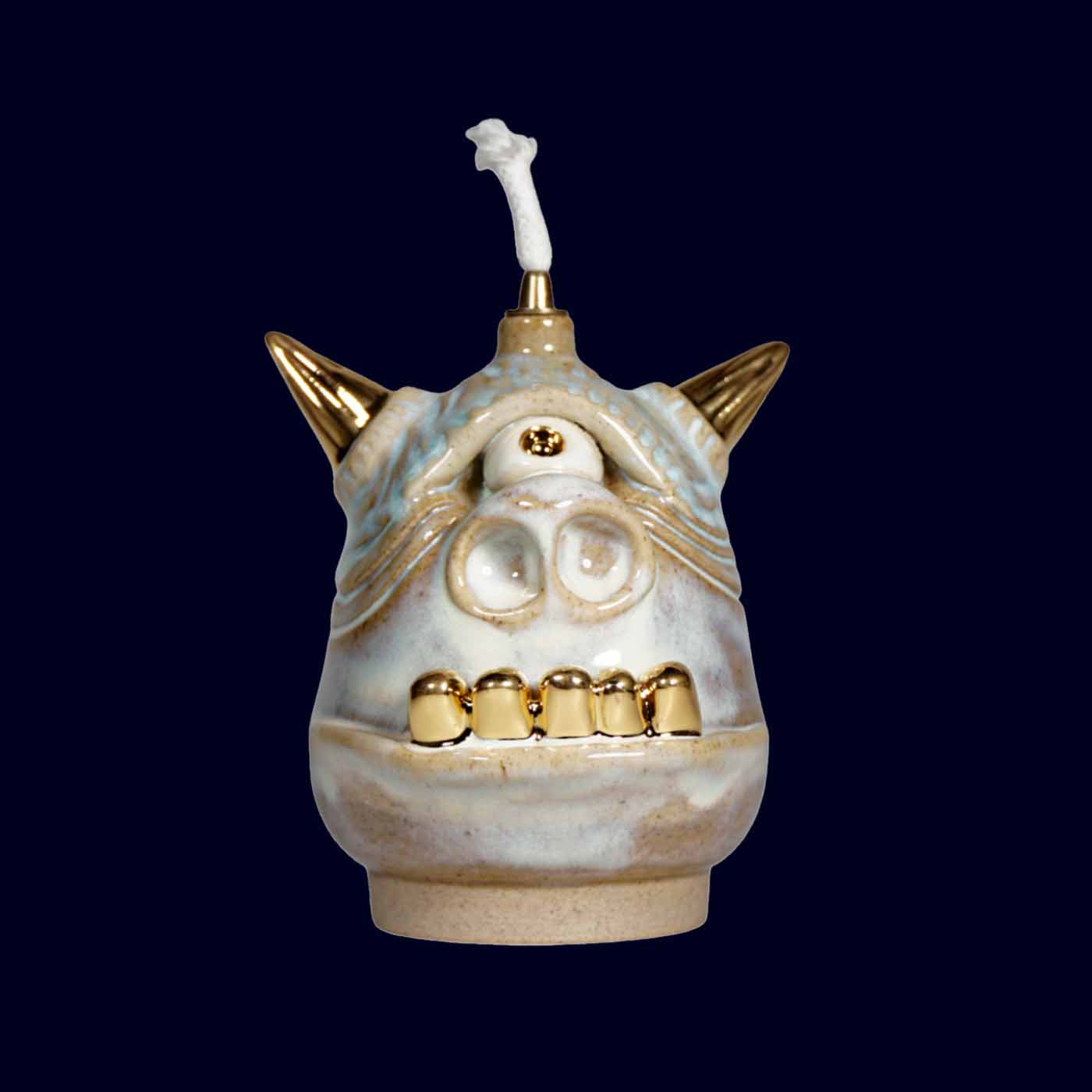 Thrown on the wheel and sculpted by hand, this guardian carries a quieter presence. The glaze moves between soft powder blue, warm sand, and subtle grey undertones, creating a layered, almost weathered surface. Gold horns, teeth, and third eye punctuate the calm with precise contrast.