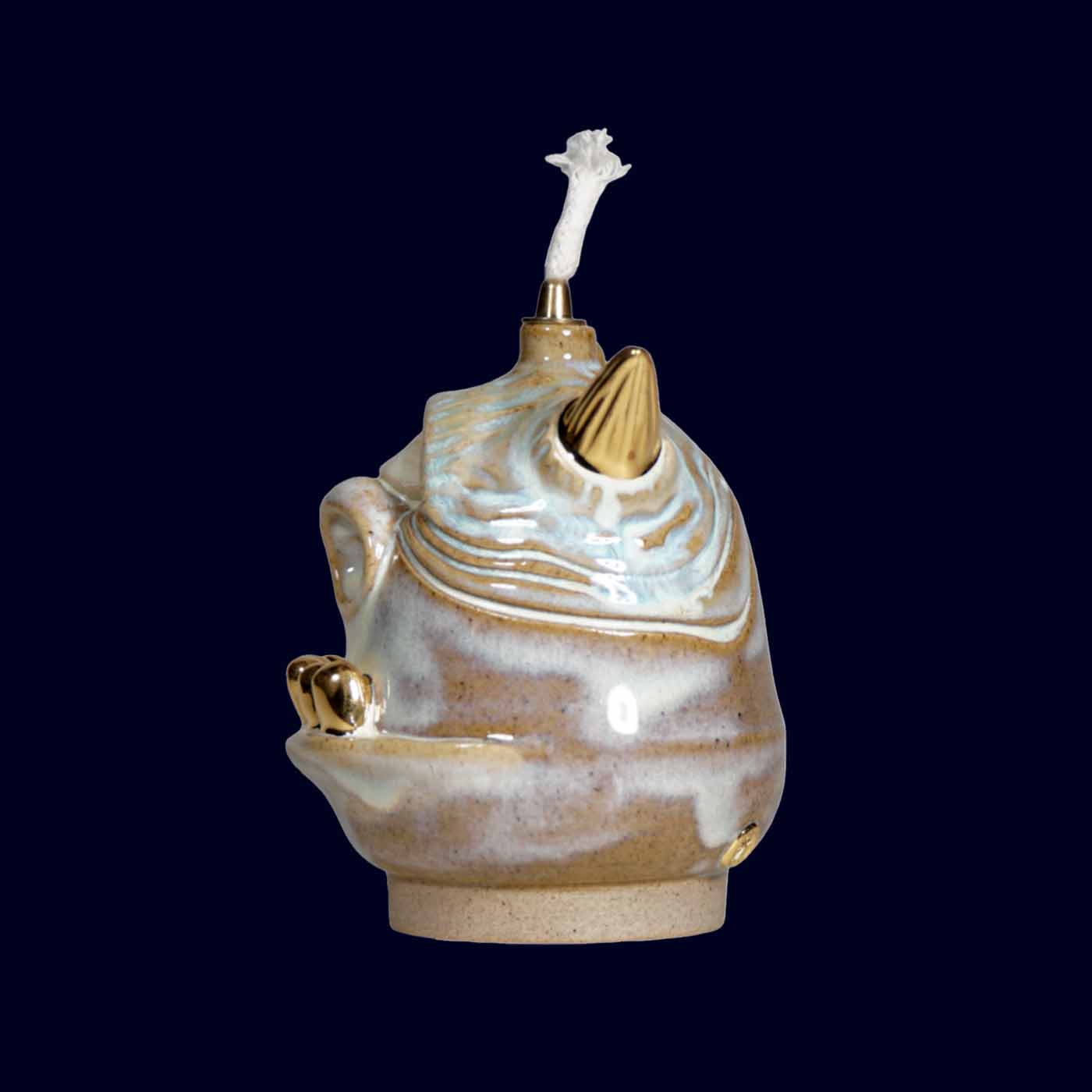 When lit, the flame rises from the crown and the piece shifts from sculptural form to ritual object. Restrained in tone. Steady in character.
