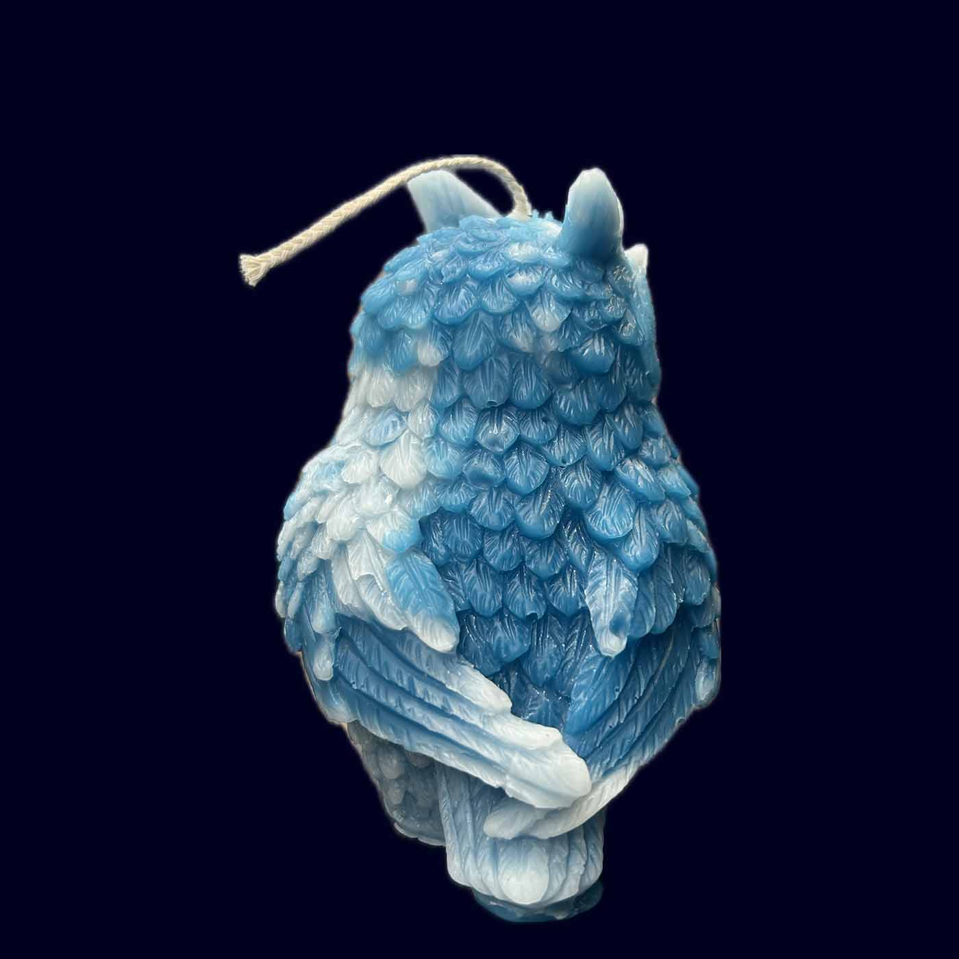 A wise presence in vivid blue. Photerian’s Large Owl stands approximately 5.5", with layered feathers, wide luminous eyes, and a posture that feels both regal and gently humorous. The marbled blue wax gives it an icy, celestial glow—like an owl carved from winter sky.