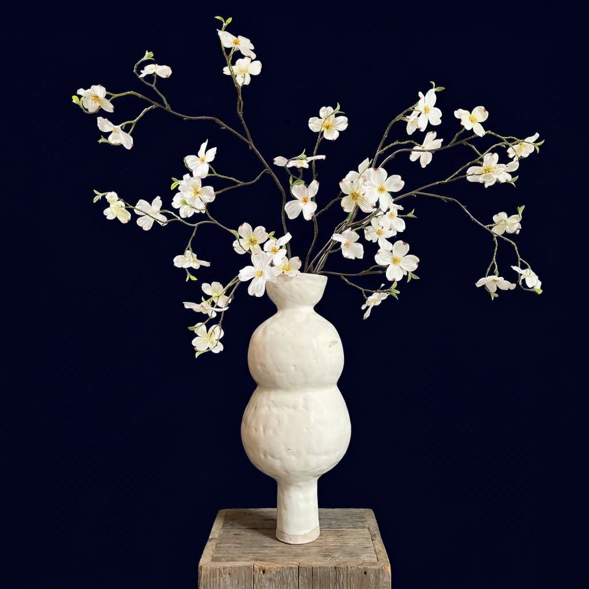 The wide open cup was made for branches — cherry blossom, dogwood, quince, forsythia, anything that needs space to breathe and spread. Tall grasses, dried pampas, a single dramatic stem. It holds them all with the same unhurried confidence.