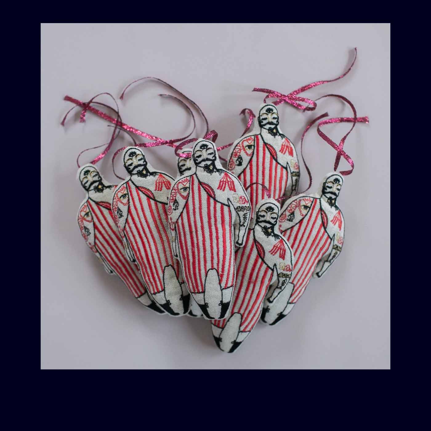 A tribute to vintage circus charm, the Tattooed Strong Man Ornament is a playful nod to old-world showmanship and artistry. Each piece is hand-cut, turned, and lightly stuffed with organic cotton—crafted with care from an original illustration. Free-motion embroidery in crimson, metallic gold, and nude tones brings this miniature strongman to life, while bold black stitching outlines his confident stance. Unlike our lavender-filled designs, this ornament is unscented, making it ideal for those who prefer a purely visual delight. WHY IT'S SPECIAL This isn’t just a holiday ornament—it’s a year-round conversation piece. Whether it’s hanging from a tree, topping a gift, or adding whimsy to a bookshelf, the Tattooed Strong Man brings a dash of nostalgic charm wherever he goes. Its smaller scale also makes it a delightful companion to our original, larger Strong Man Art Doll—perfect for collectors or anyone who loves handcrafted curiosities. DETAILS Hand-cut, turned, and stuffed with organic cotton Free-motion machine embroidered in crimson, metallic gold, and nude on natural linen Outlined in bold black thread from an original illustration Unscented (no lavender filling) Metallic braided ribbon loop for easy hanging Size: Approx. 6” H x 3” W Smaller than the original Tattooed Strong Man Art Doll THE BRAND Skinny Cotton celebrates the art of storytelling through textiles. Each ornament is a small-scale piece of art—individually crafted, thoughtfully embroidered, and designed to bring character and charm into everyday spaces.