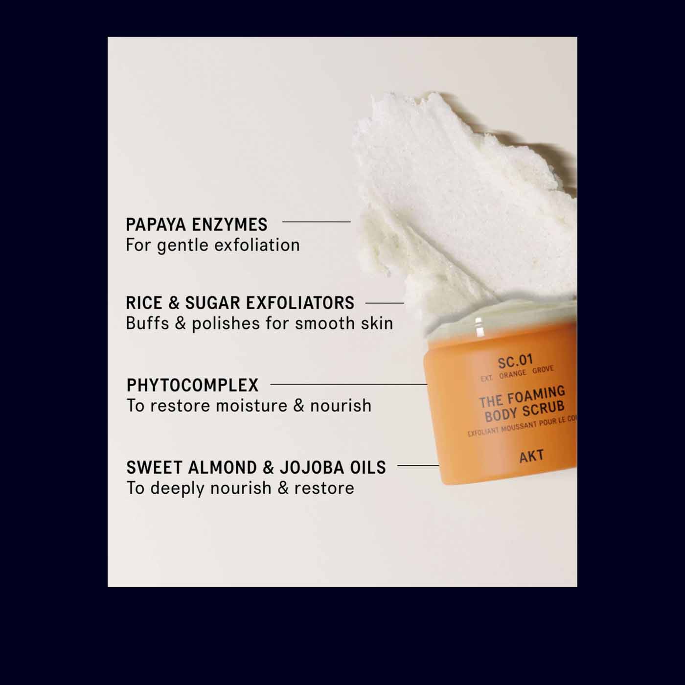 Nourishing oil complex: jojoba, sweet almond, olive squalane, and borage oil soften as you scrub.