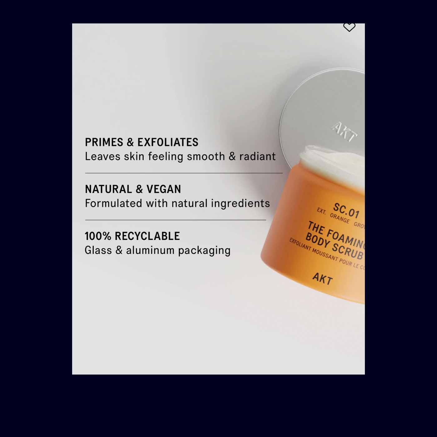 Three years in development by the London-based team behind AKT—a brand that started with deodorant and applied the same obsessive standard to body care. Independent user trials on 55 people: 95% said skin looked smoother, 95% felt it was softer, 89% reported more glow. Packaged in glass and aluminum, both endlessly recyclable.