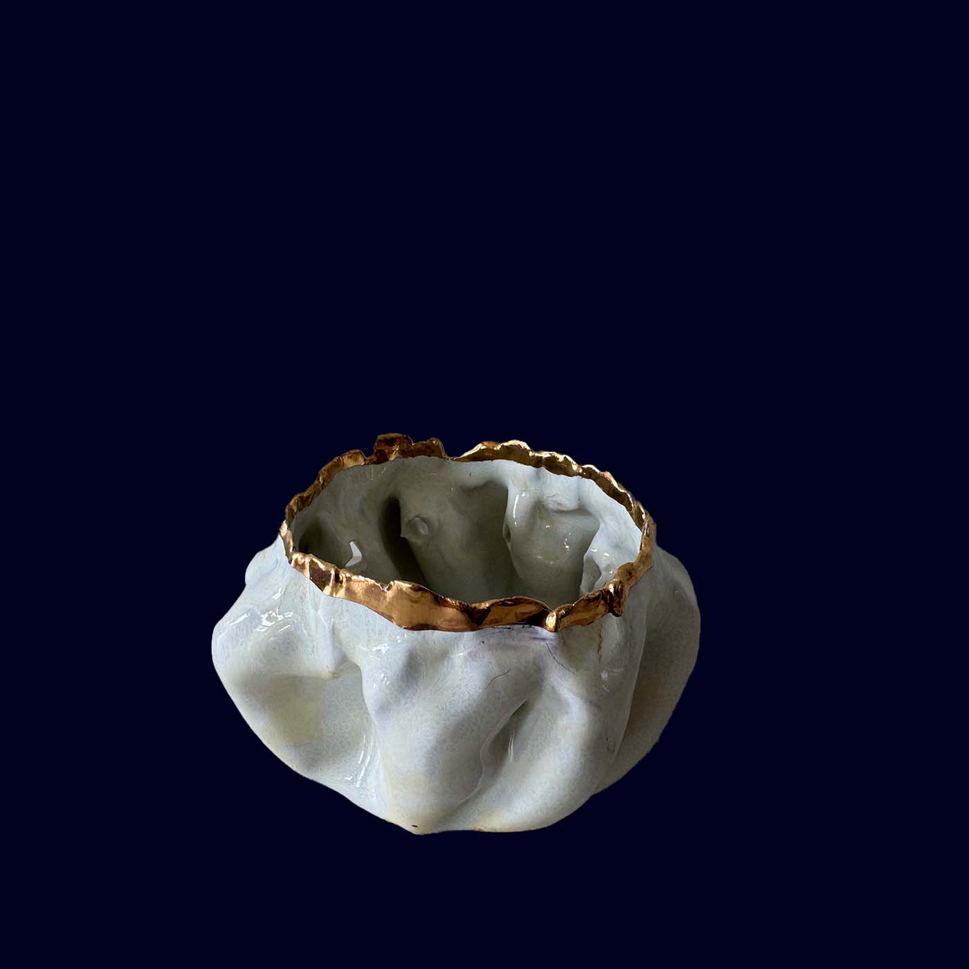 Shaped entirely by hand, each catch-all carries subtle folds and impressions that reflect the making process. The contrast between the matte white surface and the warm gold rim gives the piece a quiet elegance—never precious, always tactile.
